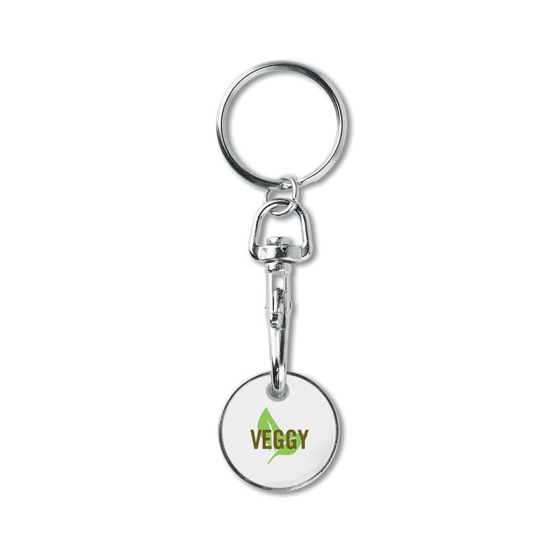 Metalni privjesak u obliku kovanice eura. Imitacija emajlnog premaza na prednjoj strani. Pogodno za kolica u trgovini.