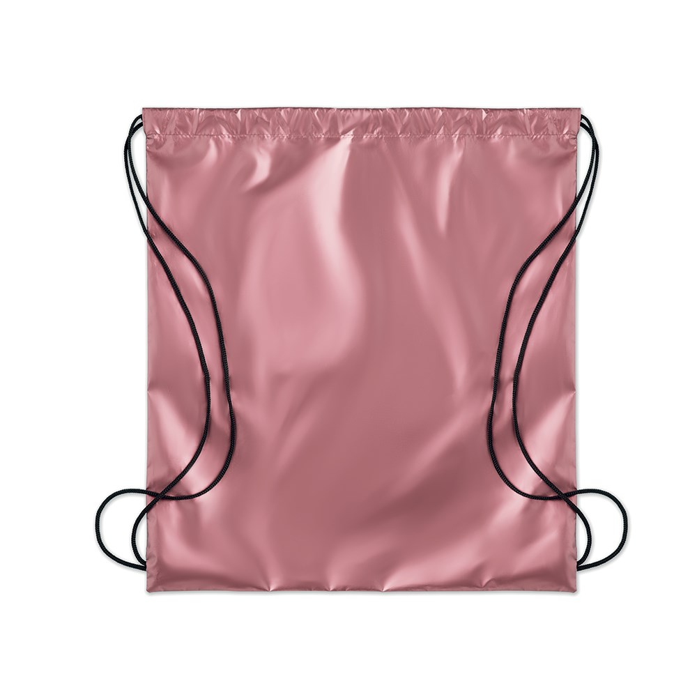 Vrećasta torba od sjajnog poliestera s crnom špagom za zatvaranje i nošenje. Dimenzije: 36x40 cm.