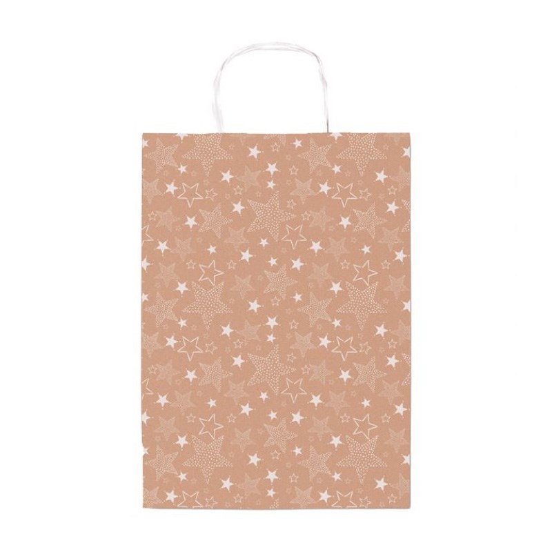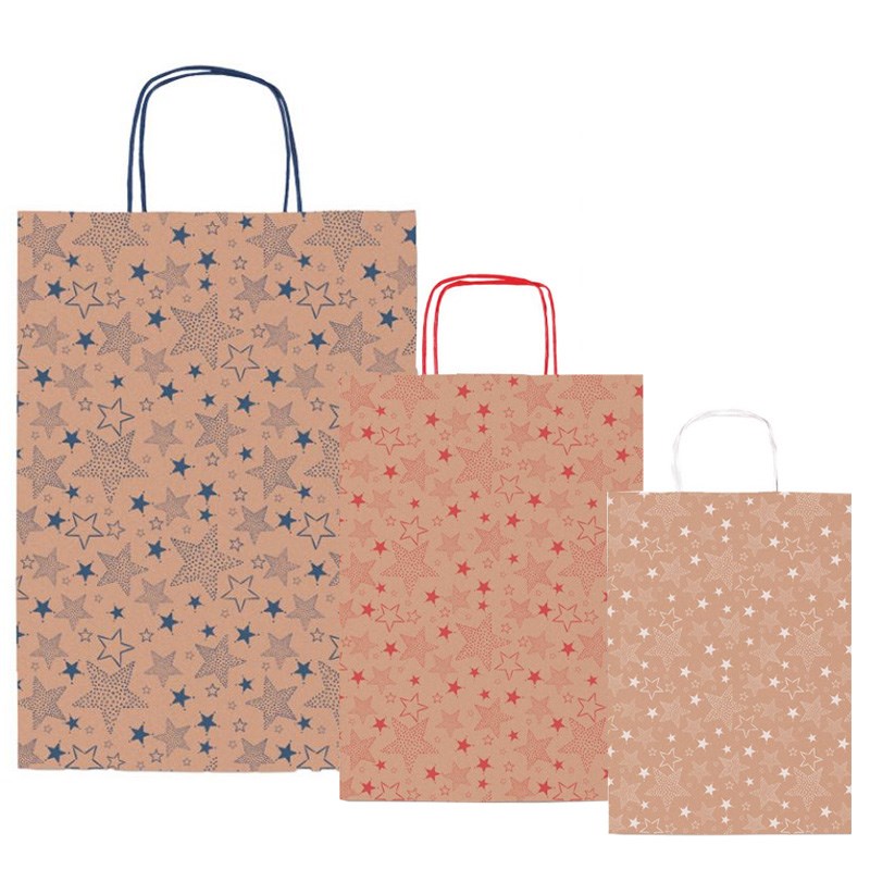 Vrećice ukrasne od smeđeg kraft papira. 110g, pletene ručke. Tri dimenzije u različitim bojama tiska.