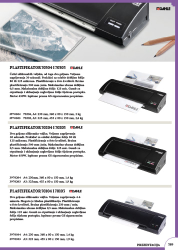 Plastifikator dokumenata Dahle 70103 primjeren je za domaću upotrebu, škole, manje urede. Odlikuje ga niska potrošnja energije i jednostavna te sigurna upotreba.