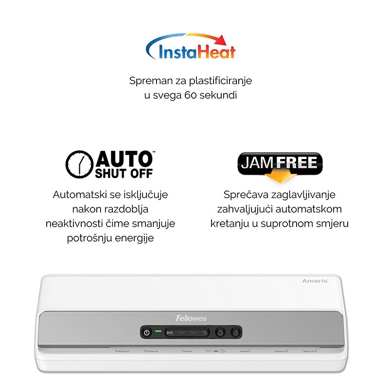 Uredski plastifikator Amaris plastificira dokumente do A3 formata (maksimalna širina 324 mm); pomoću 6 valjaka, plastificira i fotografije. Koristi folije 80 do 175 mikrona, ima vrijeme zagrijavanja do 60sekundi i 4 temperaturnih postavki za toplu i hladnu plastifikaciju