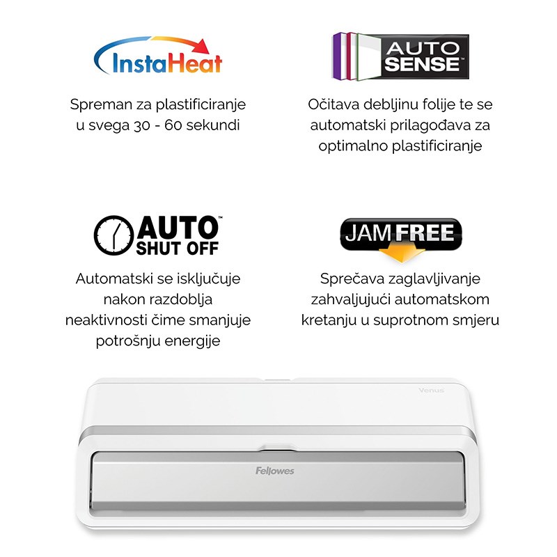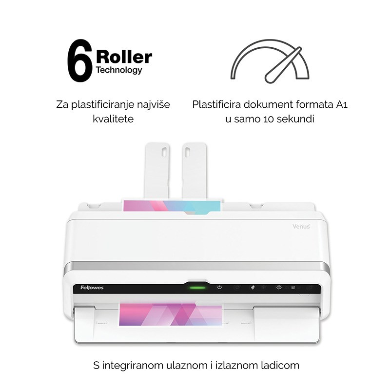 Venus A3 plastificira A4 mapu za samo 10 sekundi (2180 mm/min maks. brzina). Spreman je za plastificiranje za 30-60 sekundi zahvaljujući InstaHeat tehnologiji.