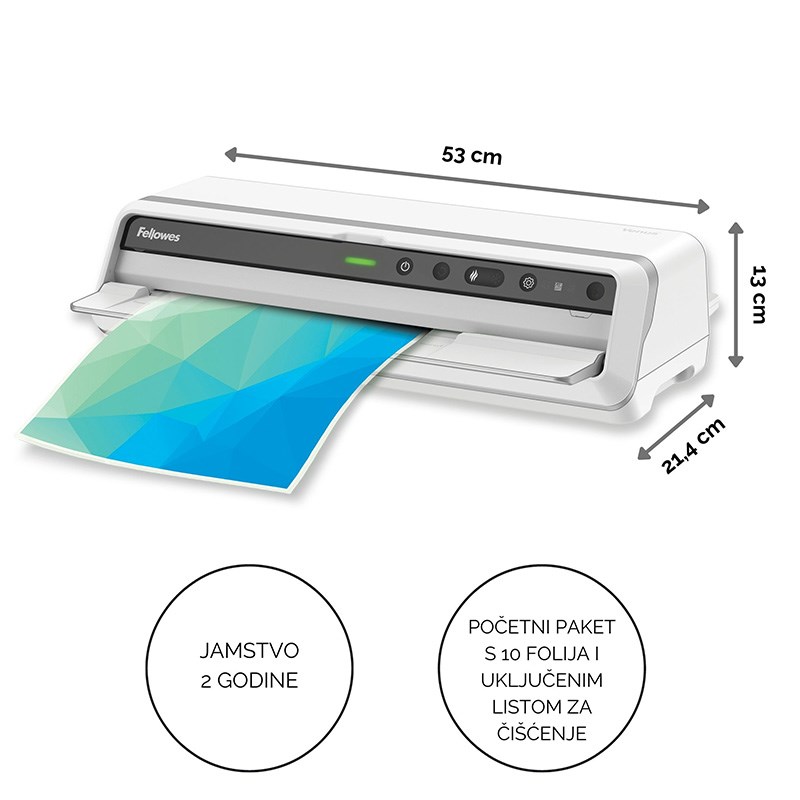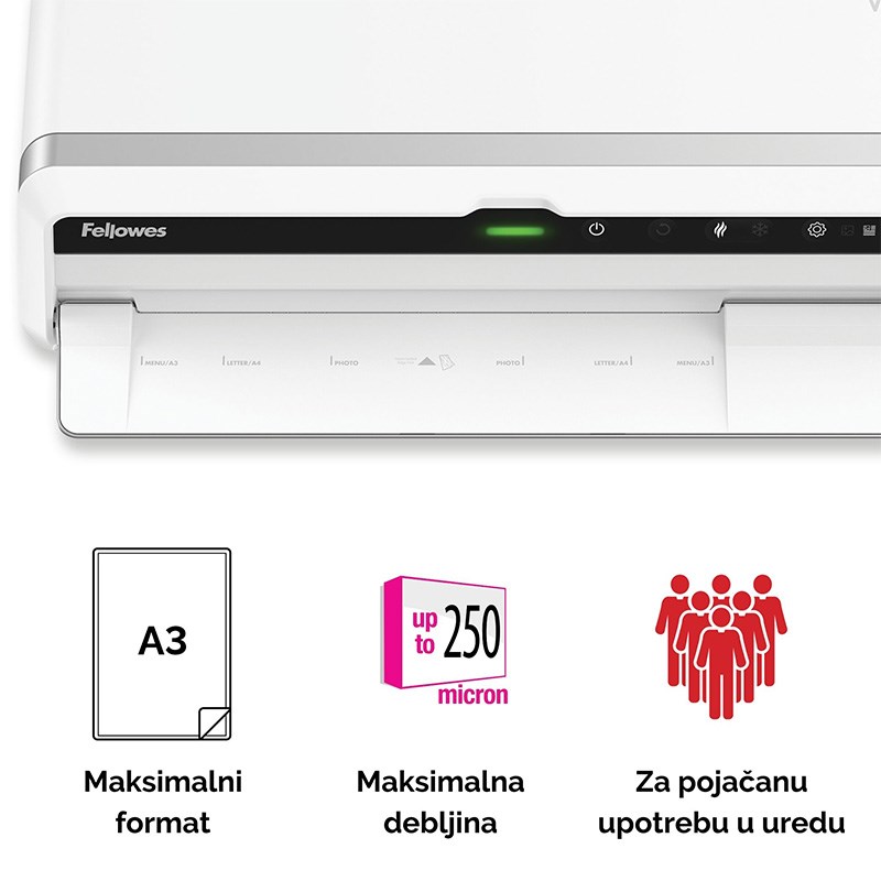 Opremljen sa 6 valjaka za vrhunsku kvalitetu plastificiranja, prihvaća sve folije do A3 i 250 mikrona (2 x 250).
