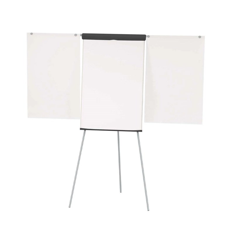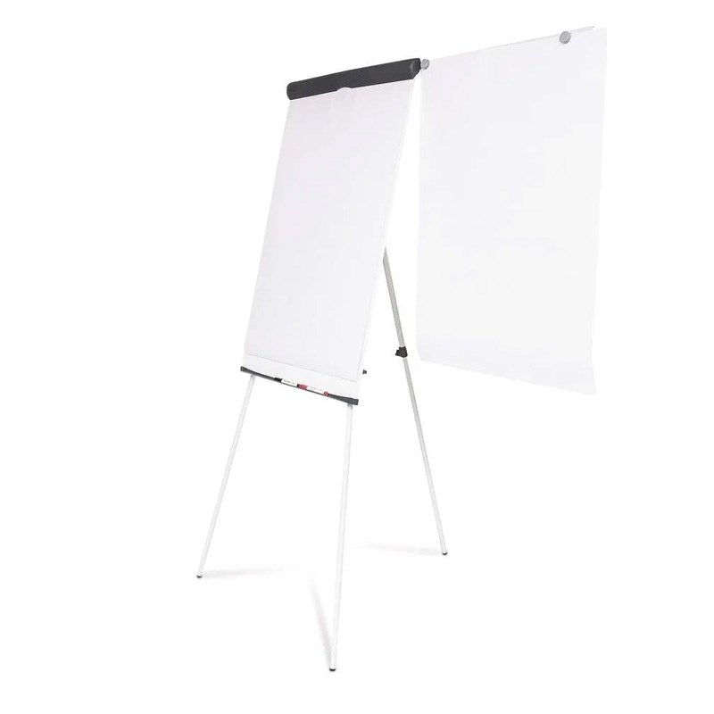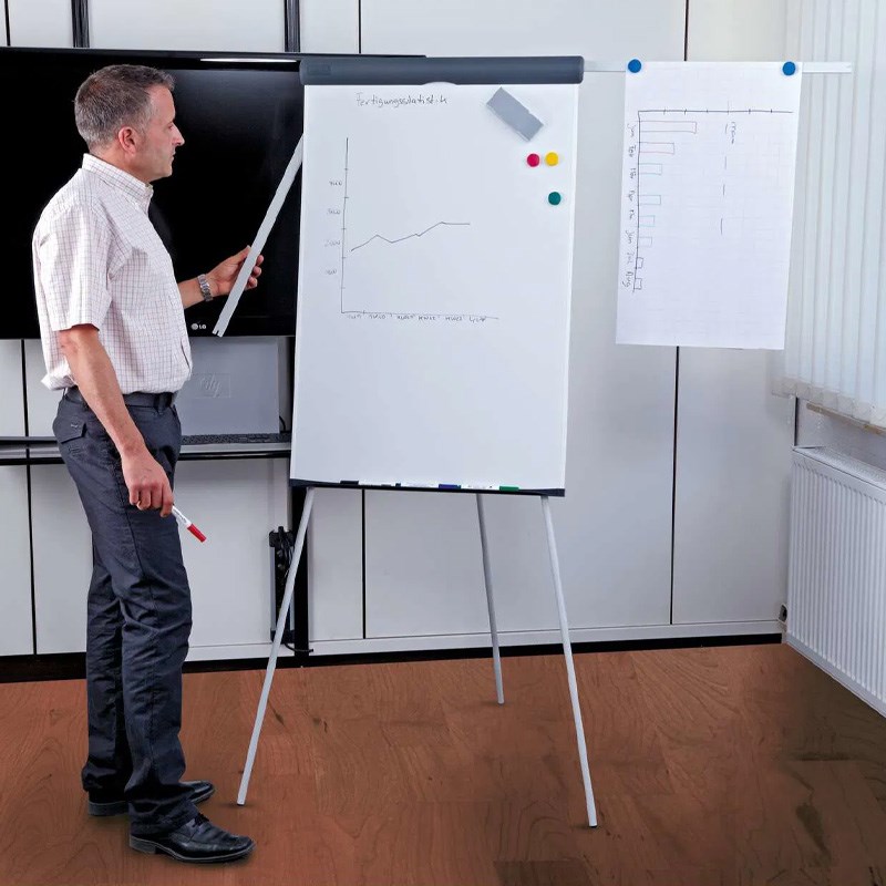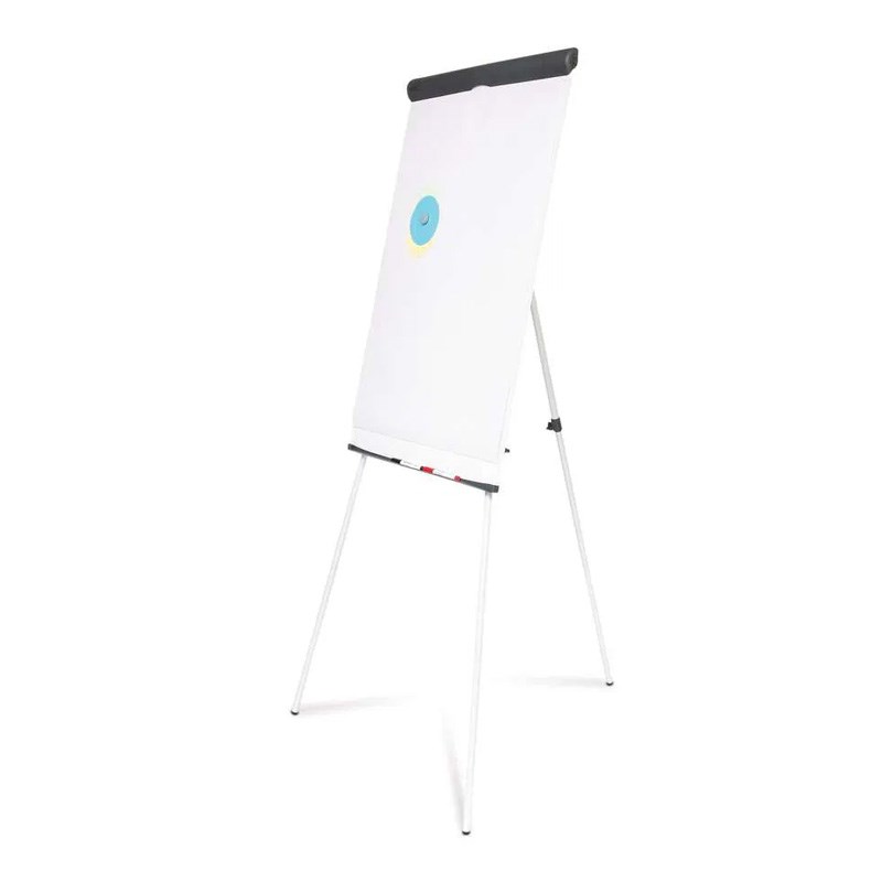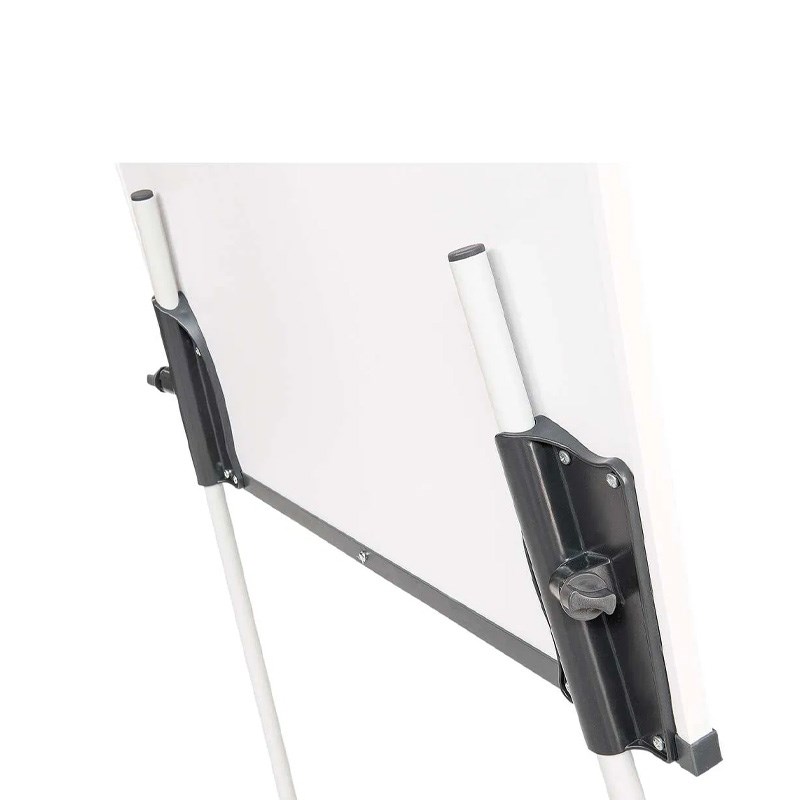 Magnetna bijela ploča 66x97 cm za pisanje whiteboard markerima, korištenje magneta i držanje flipchart blokova. Tri podesive metalne noge, ladica za pribor.