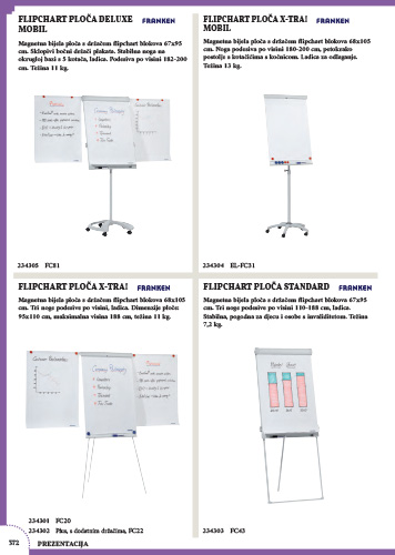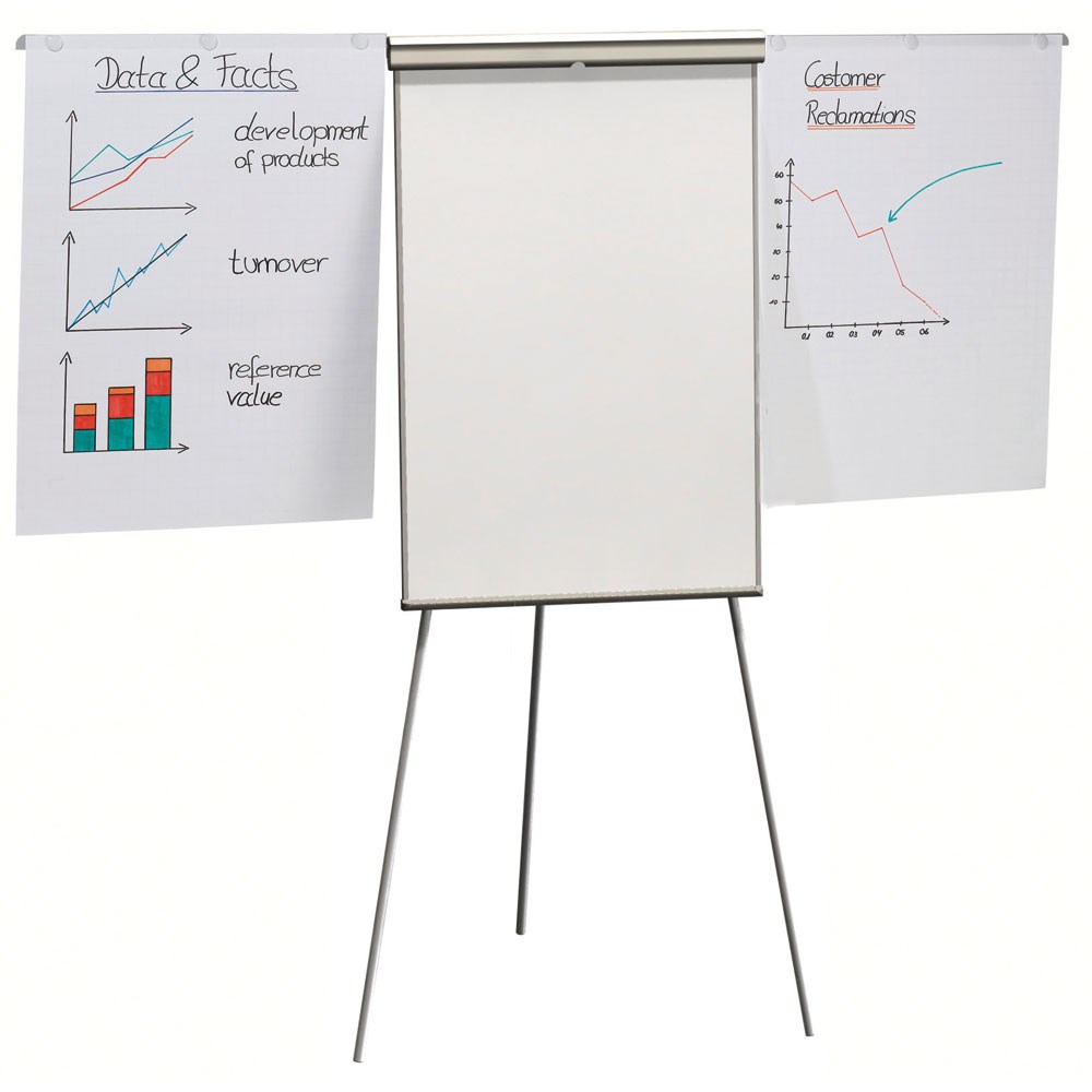 Magnetna bijela ploča s držačem flipchart blokova 68x105 cm. Sklopivi bočni držači plakata. Tri noge podesive po visini, ladica. Dimenzije ploče: 95x110 cm, maksimalna visina 180 cm, težina 11 kg.