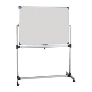 Dvostrana whiteboard ploča na okretnom stalku s kotačima. Aluminijski okvir, držač za markere i brisač.