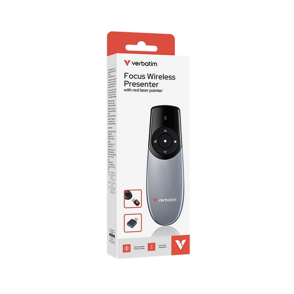 Focus bežični prezenter dizajniran je za one koji cijene i performanse i estetiku. Njegov glatki, konturni dizajn prirodno leži u ruci. Pažljivo postavljene tipke omogućuju besprijekorne prijelaze između slajdova i prebacivanje između zaslona, dok va koristiti sve njegove funkcije bilo gdje unutar 30 metara od računala zahvaljujući pouzdanoj bežičnoj tehnologiji od 2,4 GHz.