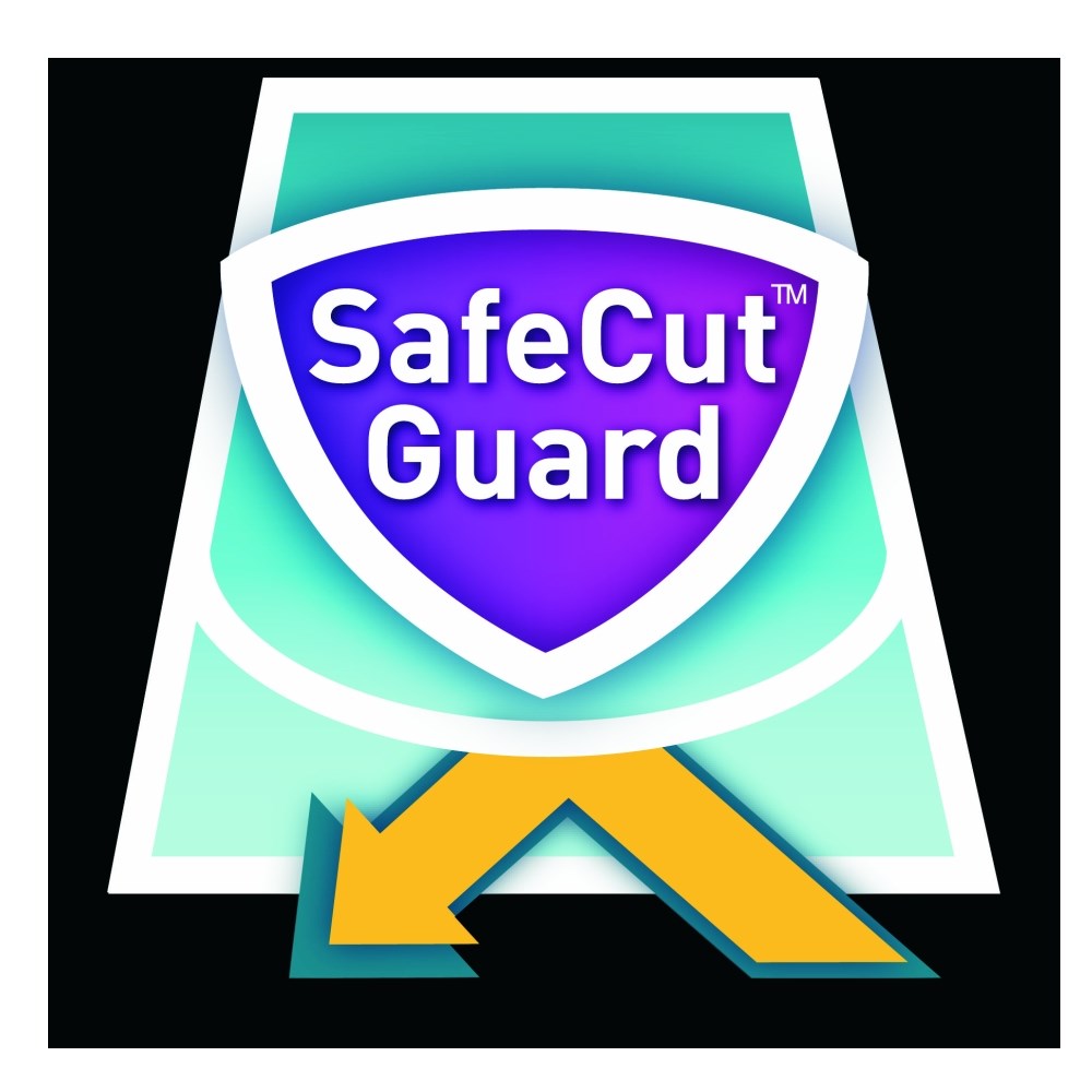 Stolni giljotinski rezač s ručnom prešom. Metalna radna ploha s iscrtanim mjernim jedinicama u centimetrima i inčima, kutovima i veličinama fotografija. Zaštitna SafeCut sigurnosna ploča se podiže u radni položaj, bez čega se ne može otpočeti s radom