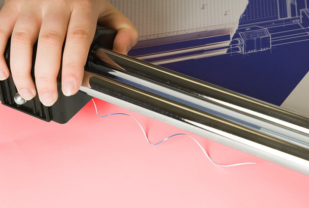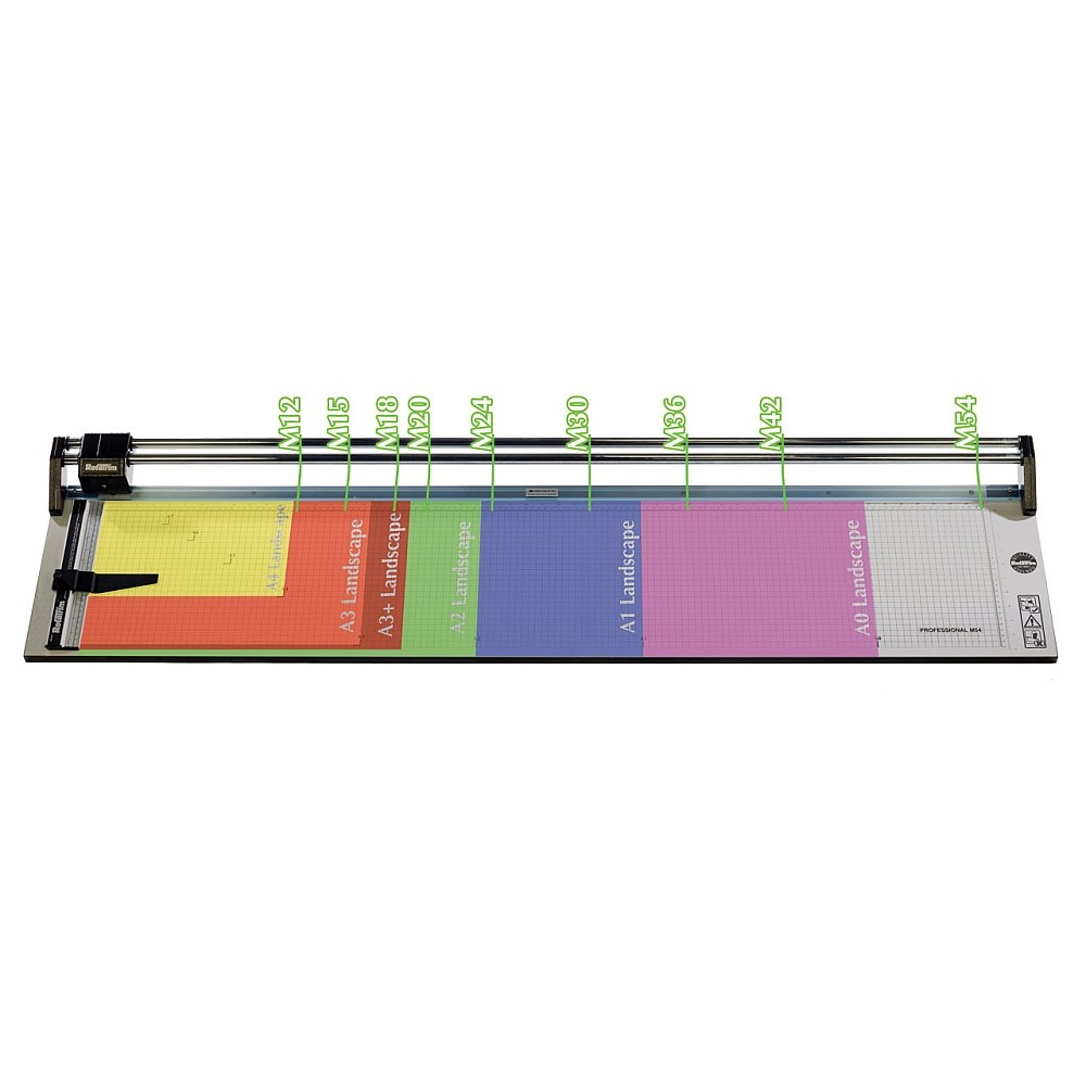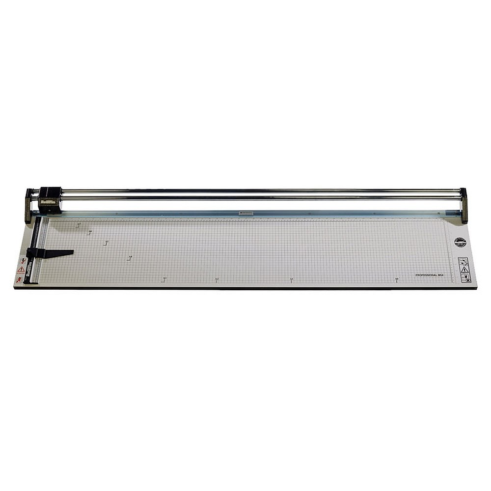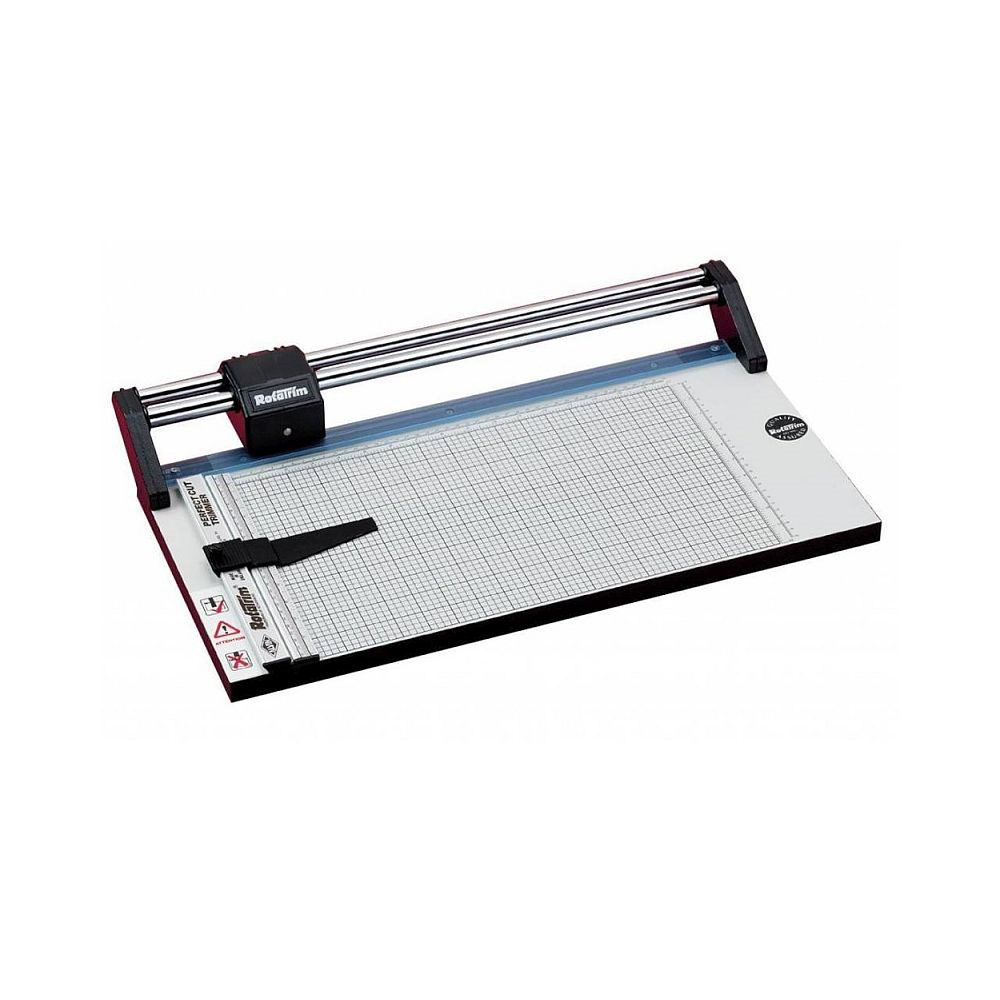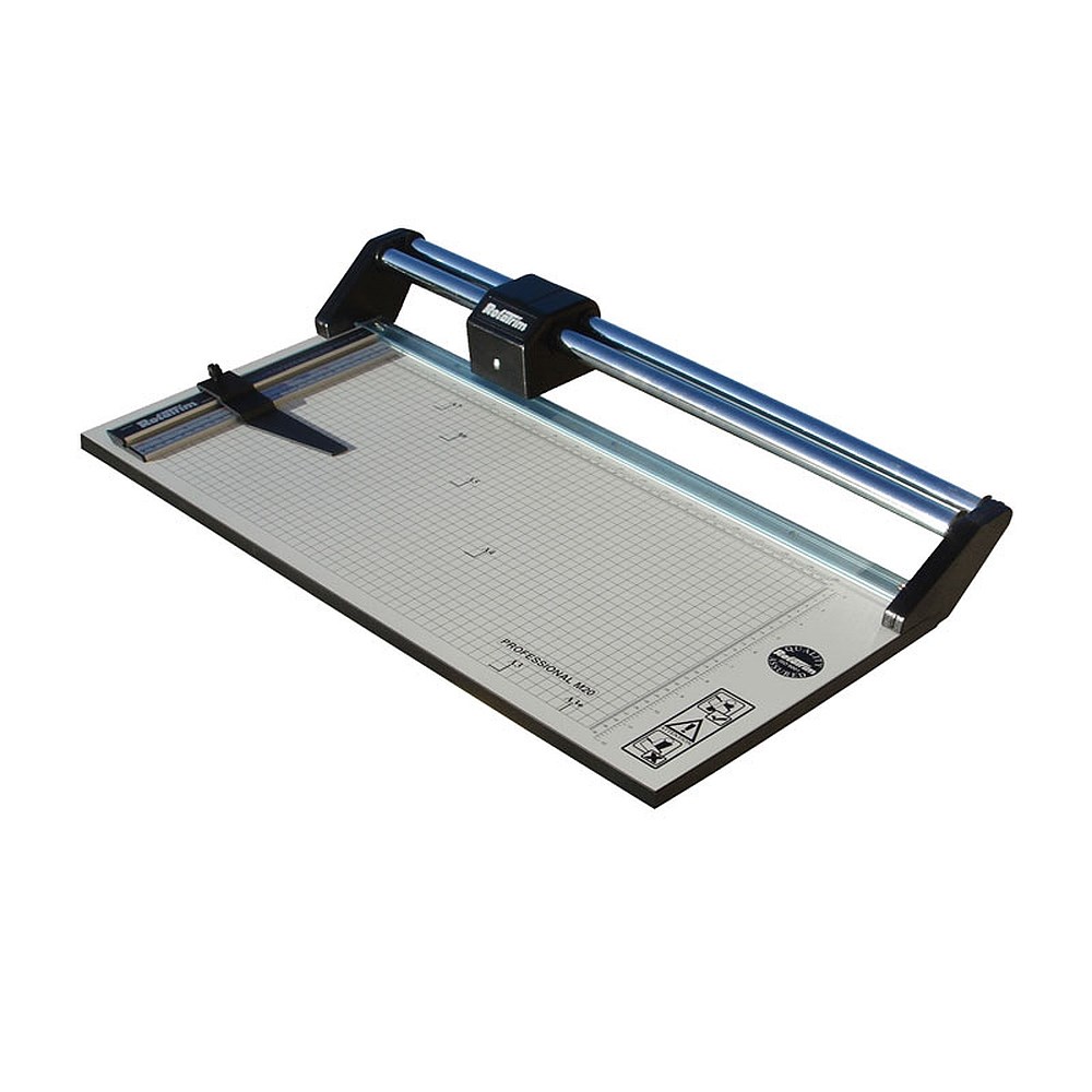 Profesionalni cirkularni rezač. Kromirane čelične vodilice, metalna rezna glava i kotač iz tungsten čelika. Transparentni pritiskivač rezanog papira. Radna površina ima 10 milimetarski raster te oznake u mm i inčima i stražnji, pomični graničnik.