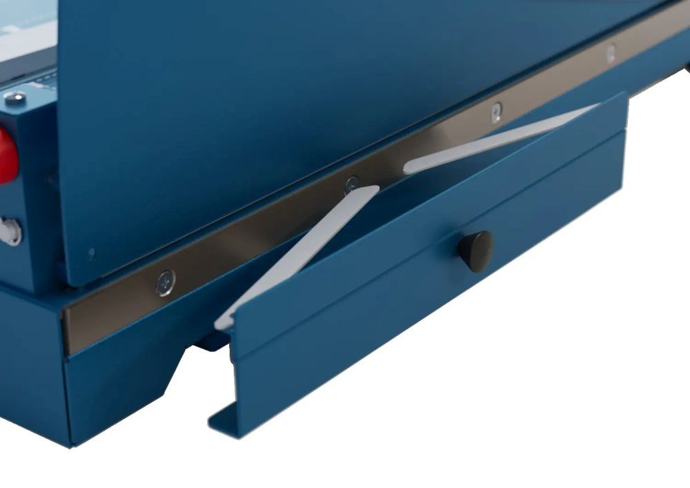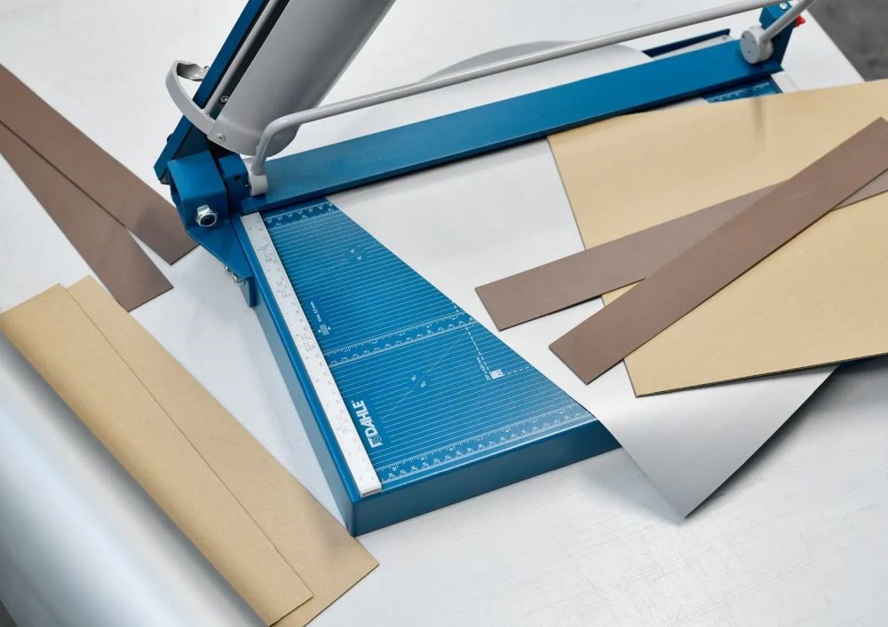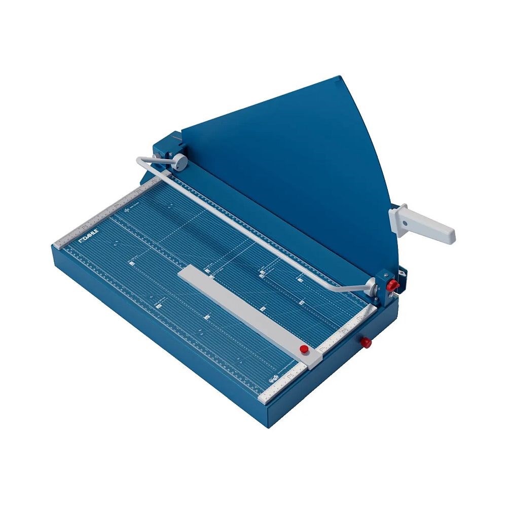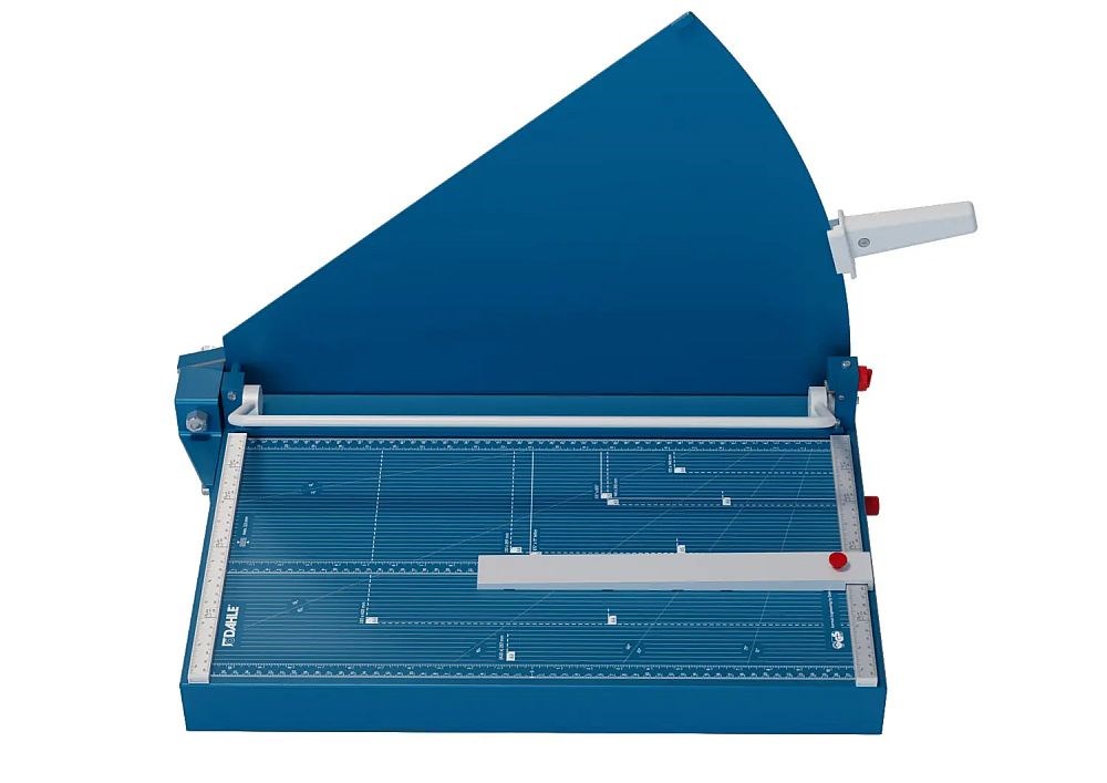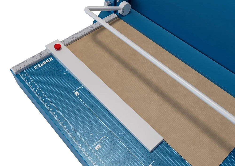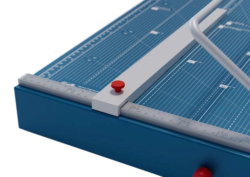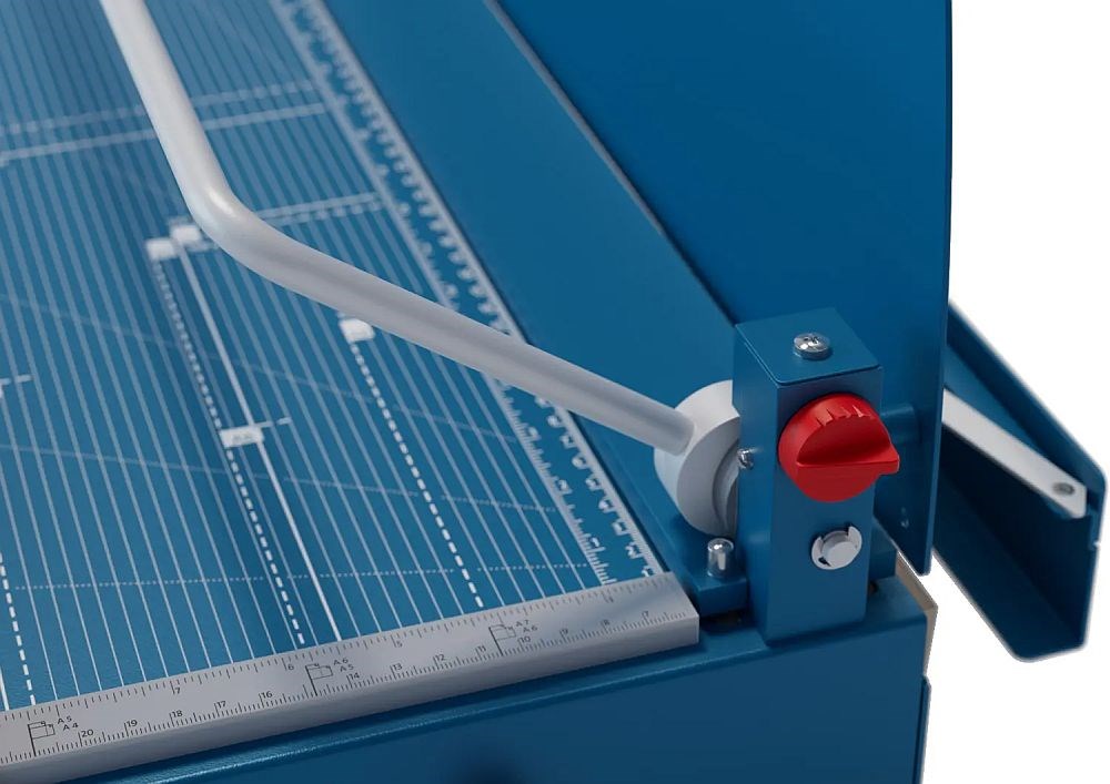 Gornja i donja oštrica su od kvalitetnog, oštrivog brušenog čelika, a tu su i učvršćujuća manualna preša i dvije vodilice s oznakama u cm i inčima te DIN mjerama. Ima podesiv stražnji graničnik, kao i izvlačiv graničnik odrezanog materijala (do 210 mm), a metalna radna ploha ima oznake u A formatima i kutove