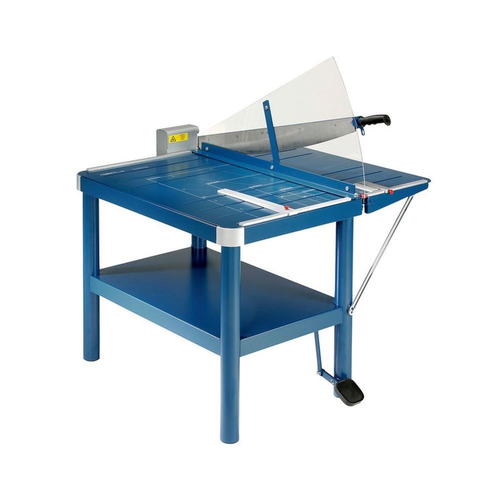 Čvrst metalni stol sa zaobljenim kutovima. Gornja i donja oštrica su od kvalitetnog, oštrivog brušenog čelika, a tu su i nožna manualna preša i dvije vodilice s oznakama u mm. Ima podesiv stražnji graničnik, kao i preklopnu prednju radnu plohu, za veće dimenzije odrezanog materijala. Metalna radna ploha ima oznake u A formatima i kutove