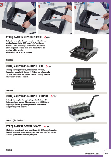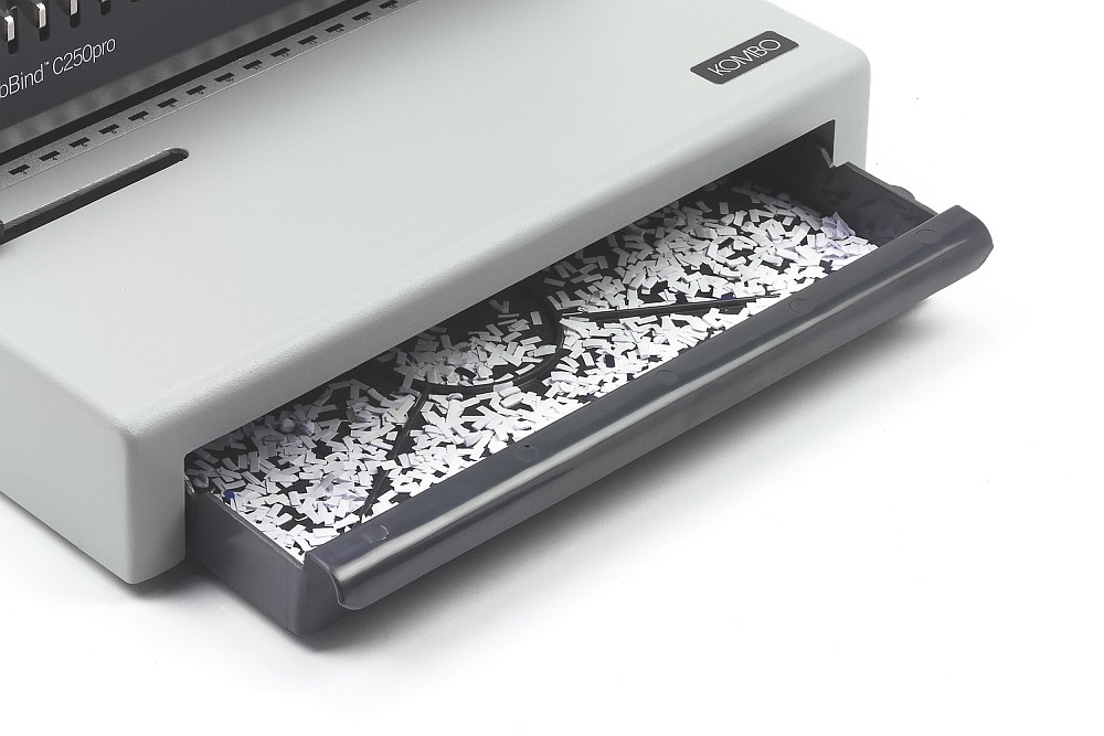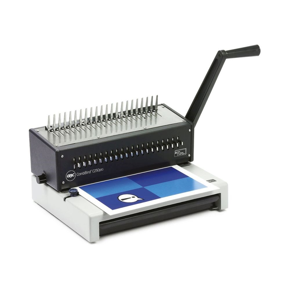 Stroj za uvez plastičnom spiralom, robusne aluminijske konstrukcije, idealan za svakodnevnu intenzivnu upotrebu, CombBind C250Pro je svestran, čvrst i izdržljiv. Jednostavan za korištenje, sa velikim kapacitetom ladice za otpad, on ima mogućnost isključivanja svih noževa, regulaciju dubine bušenja (od ruba papira) te podešavanje lijeve margine.