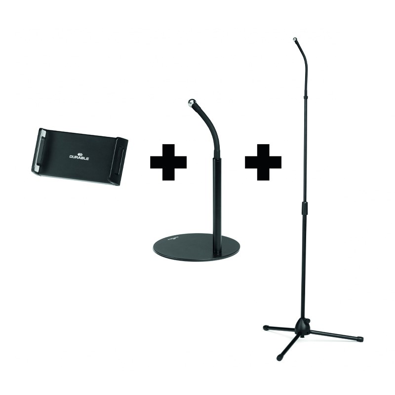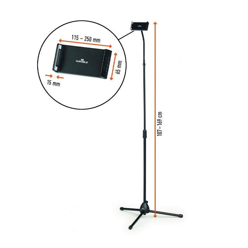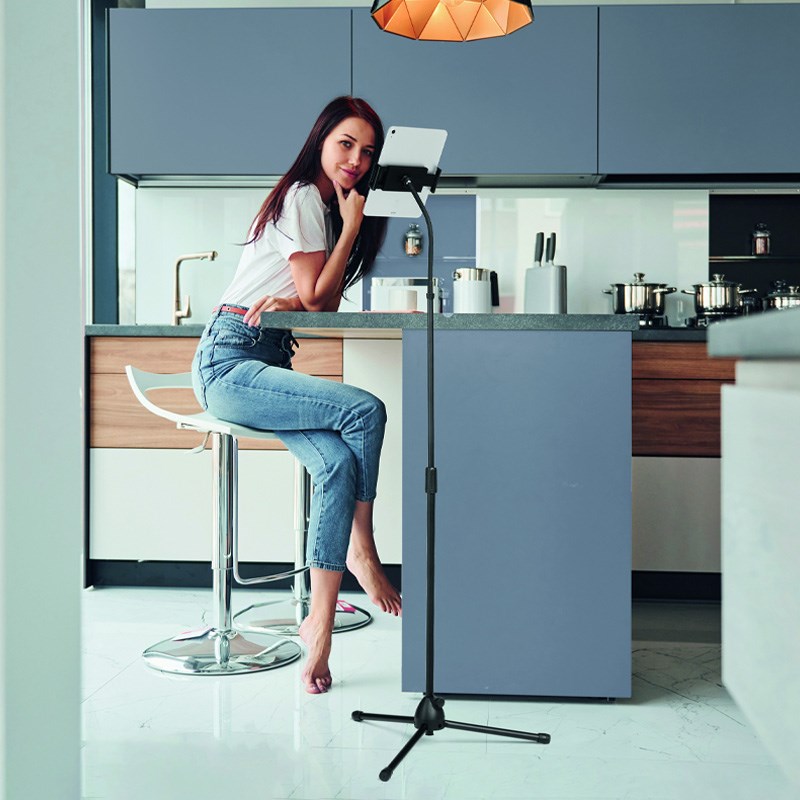 Stolni i podni stalak s držačem za tablet i mobitel, s fleksibilnom rukom i kugličnim zglobom. Prikladno za sve mobilne telefone i tablete, kao i za iPad i iPhone od 4,7-13'' do 800g. Može se podesiti pod bilo kojim kutom rotacijom od 360˚. Neograničena fleksibilnost: ovisno o primjeni , stezaljka se može montirati na stolni ili podni stalak i tako nudi beskrajne mogućnosti primjene. Pomoću teleskopske šipke stalak se može prilagoditi na bilo koju visinu do 1,69 m. Neklizajući jastučići u stezaljci drže tablet ili mobitel stabilnim i dodatno štite od ogrebotina. Upravljanje kabelom kroz integrirani izlaz za kabel u stezaljci. Sklopivi na dužinu 70 cm, te s prikladnom torbicom za nošenje.