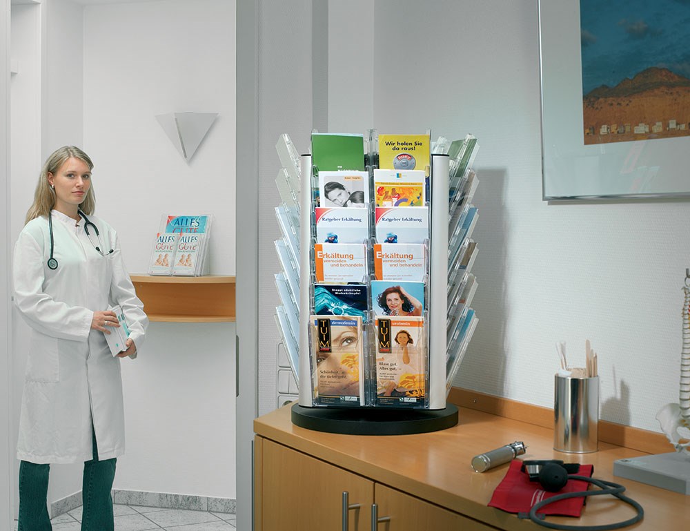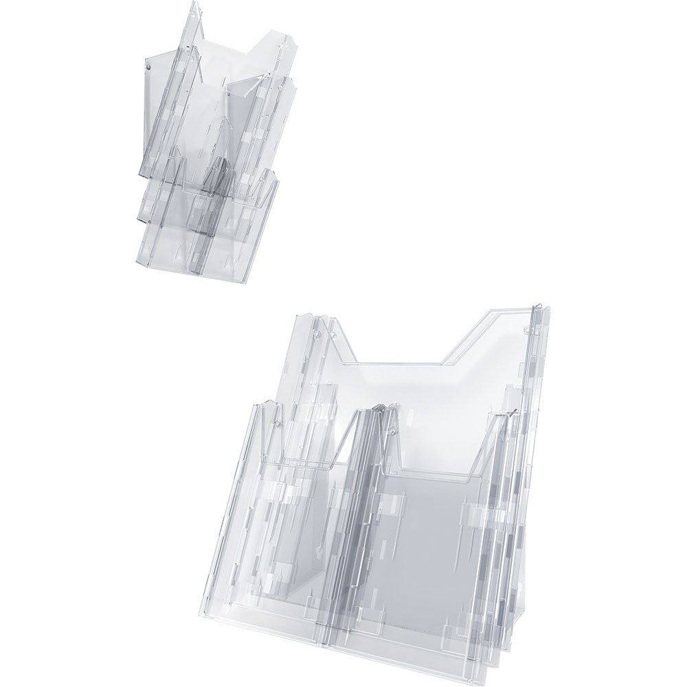 Kombinirani stalak za prospekte od prozirne kvalitetne plastike za umetanje materijala formata 1/3 A4 i A4. Sadrži 1 ladicu A4, 4 ladice 1/3 A4, dva stražnja nosača te prednju ploču. Mogućnost postavljanja na stol ili zid preslagivanjem ladica i okretanjem nosača za 180*. Lako se čisti i montira.