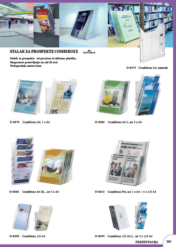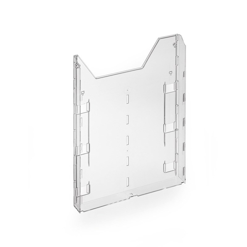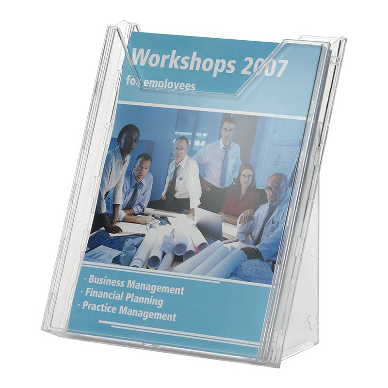 Stalak za prospekte od prozirne kvalitetne plastike za umetanje materijala formata A4 (max 240x311 mm). Sadrži ladicu, dva stražnja nosača te prednju ploču. Mogućnost postavljanja na stol ili zid okretanjem nosača za 180*. Lako se čisti i montira.