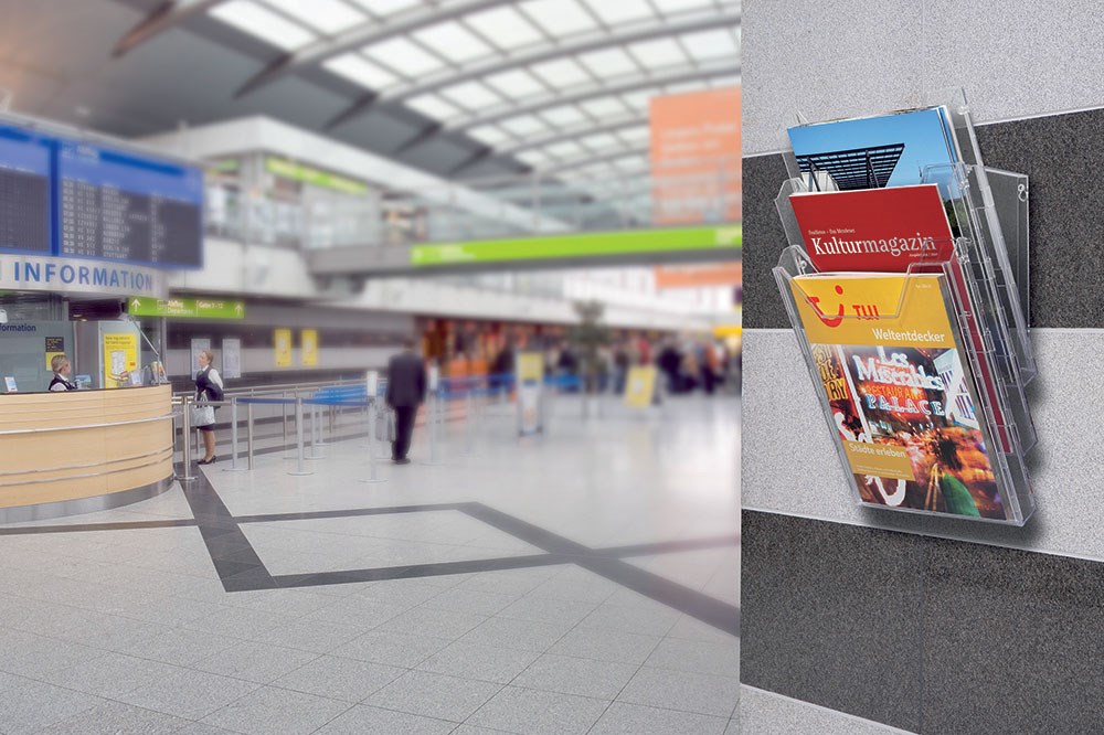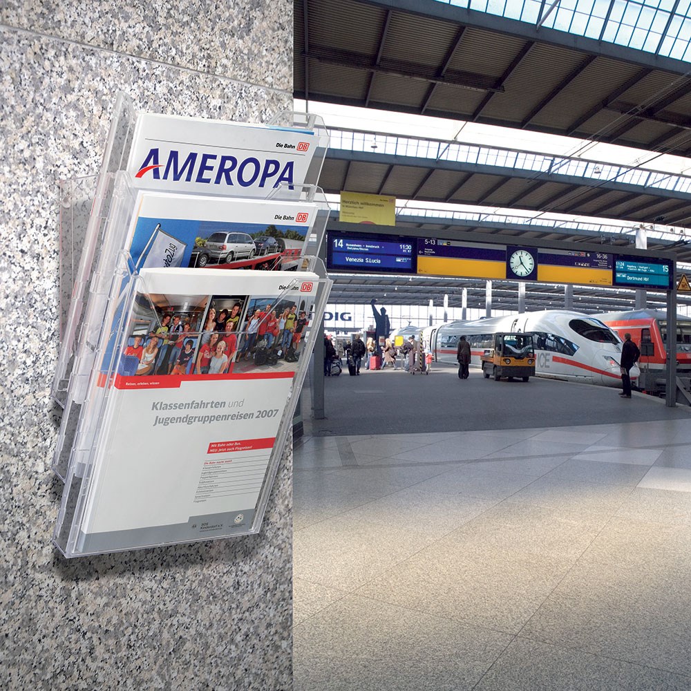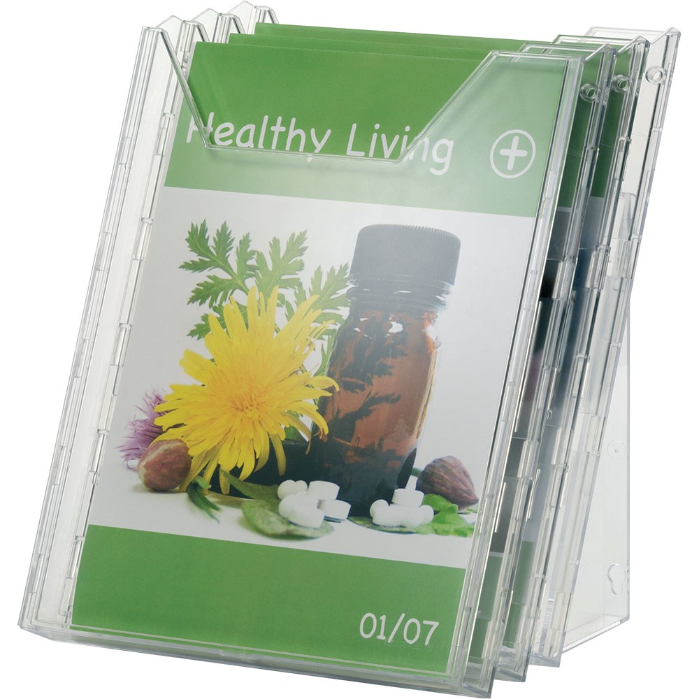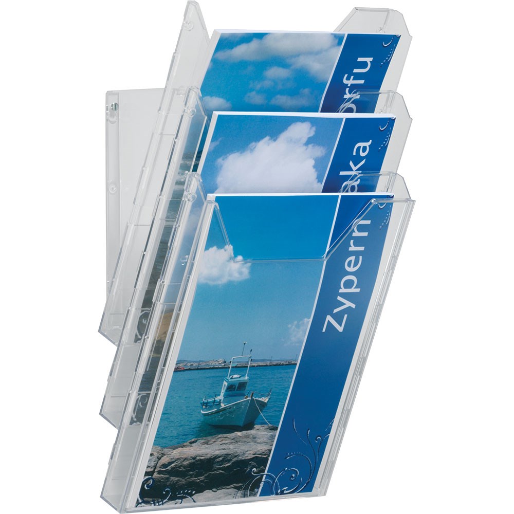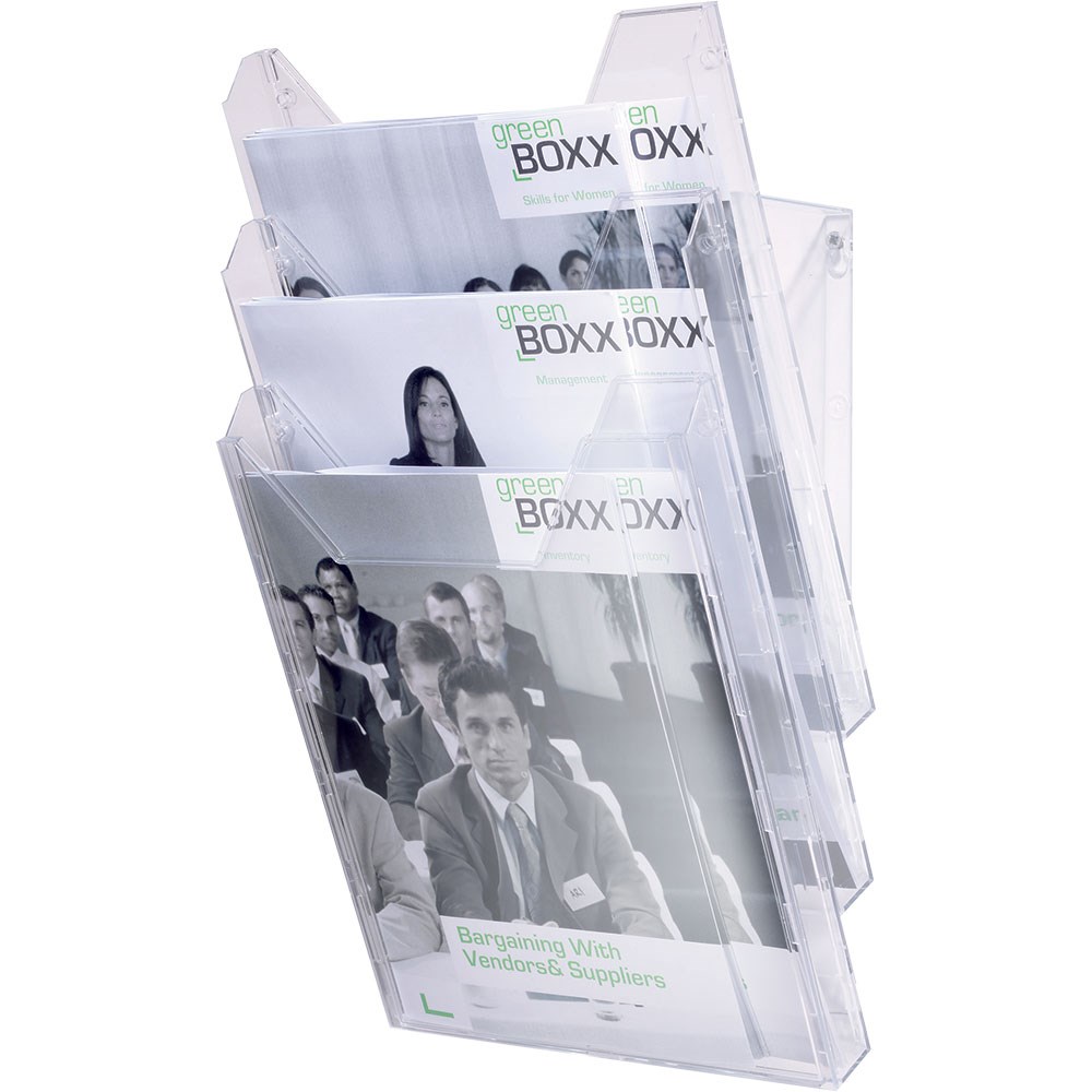 Stalak za prospekte od prozirne kvalitetne plastike za umetanje materijala formata A4 (max 240x311 mm). Sadrži 3 ladice, dva stražnja nosača te prednju ploču. Mogućnost postavljanja na stol ili zid preslagivanjem ladica i okretanjem nosača za 180*. Lako se čisti i montira.