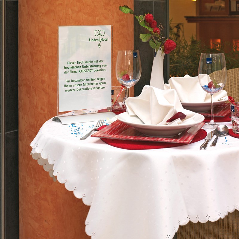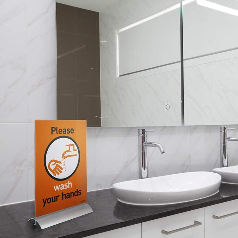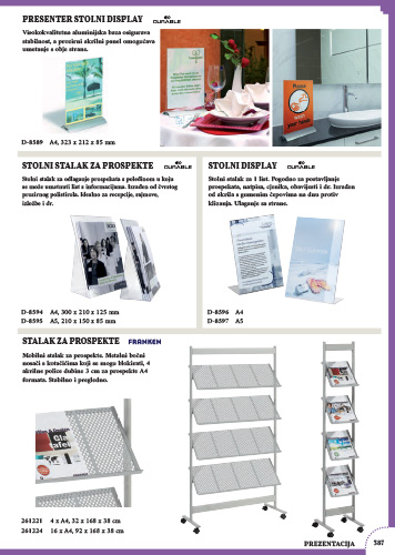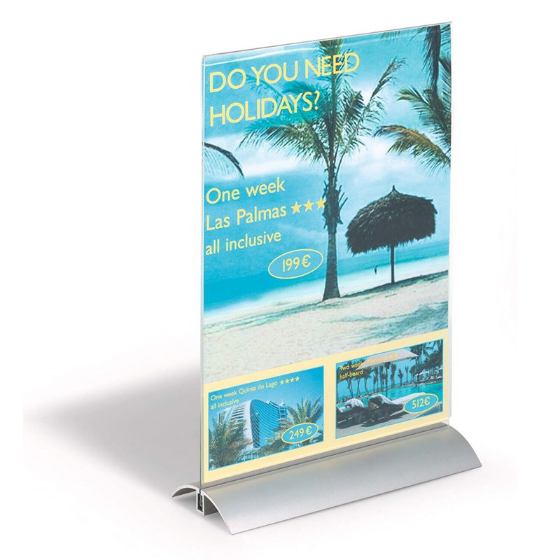 Elegantni stolni stalak za prikaz informacija, letaka, cjenika i slično. Visokokvalitetna aluminijska baza osigurava stabilnost a kristalno prozirni akrilni panel omogućava umetanje s obje strane. Dokumenti se mogu lako umetnuti i zamijeniti.