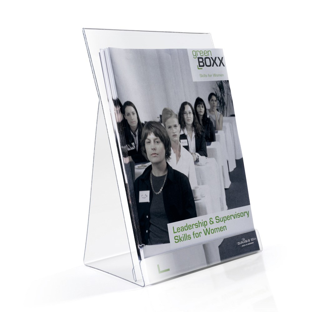 Stolni stalak za odlaganje prospekata i brošura, s poleđinom u koju se može umetnuti list s informacijama. Izrađen od prozirnog polistirola. Idealno za recepcije, sajmove, izložbe i dr. Debljina snopa 10-50mm (podesivo).