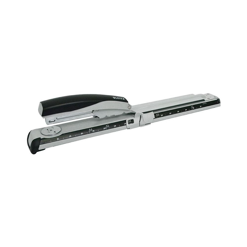 Metalna konstrukcija. Podesiva dubina klamanja do 300 mm, spajanje do 40 listova. Mjerilo u milimetrima i inčima. Namještanje formata A6 do A2. Koristi punjenja Leitz 24/6, 24/8, 26/6 ili 26/8. Idealno za klamanje brošura. Uključen paket klamerica. Otvoreno i zatvoreno klamanje.