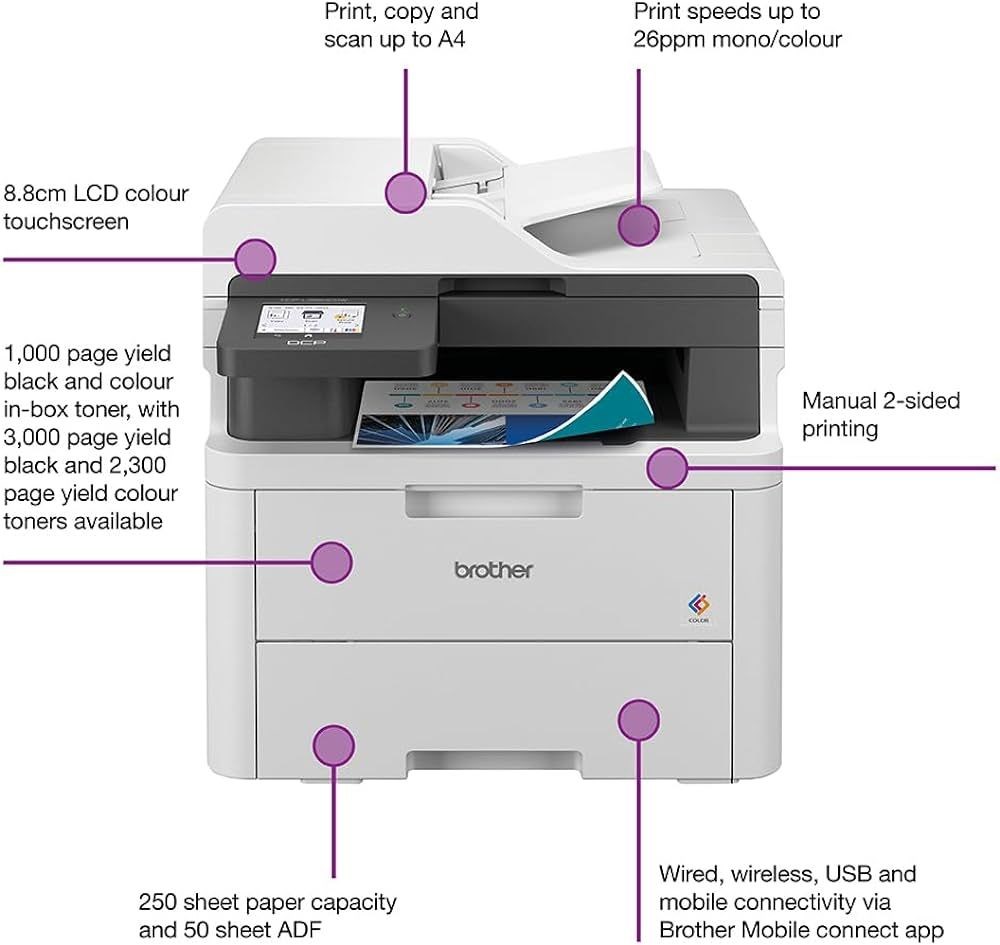 Jednostavan ispis, kopiranje i skeniranje s DCP-L3560CDW. Budući da ne zauzima puno prostora, idealan je za kućne i manje urede, kombinirajući obostrani kolor ispis, jednostrano kolor skeniranje i kopiranje, u jednom uređaju
