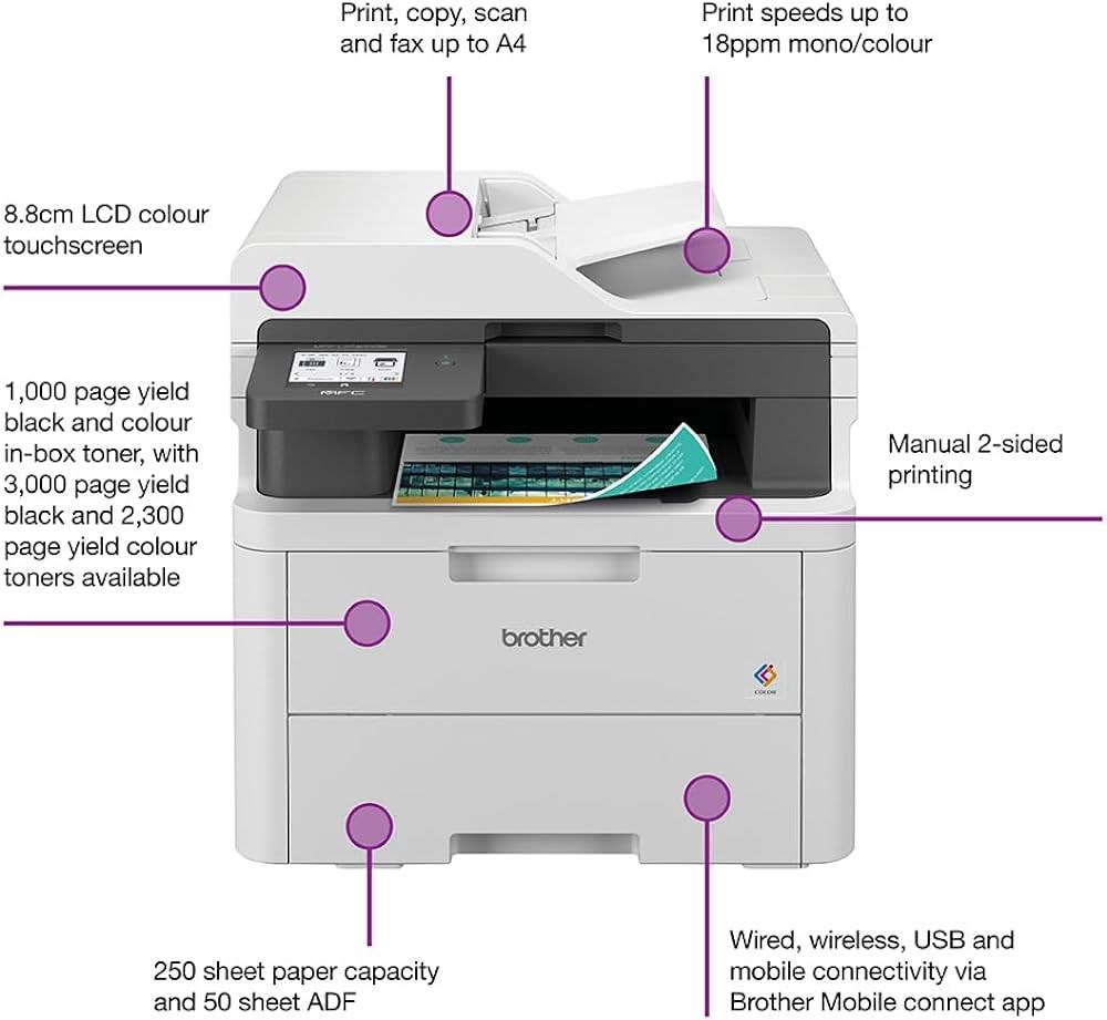 Potrošni: TN-248BK/C/M/Y (1000 str), TN-248XLBK (3000 str.), TN-248XLC/M/Y (2300 str), DR-248CL(20000 str)