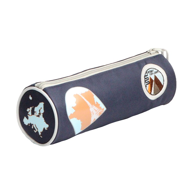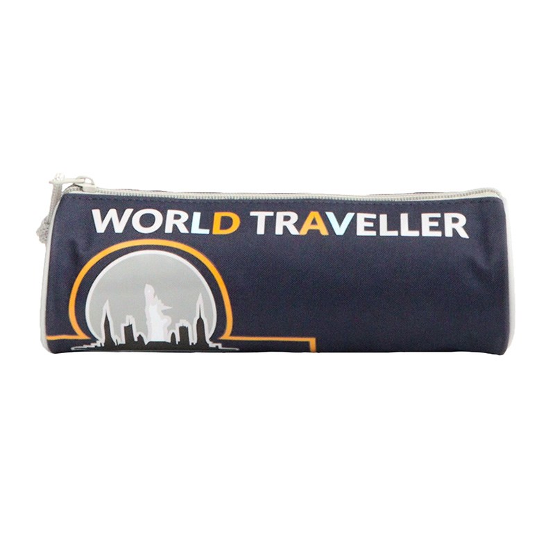 Pernica okruglog oblika za spremanje pisaćeg pribora. Motiv putovanja.