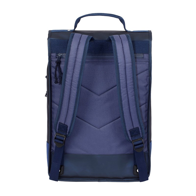 Ruksak plave sa sjajnim efektom. Vodootporan i lako periv materijal. Leđa i naramenice dizajnirane za maksimalnu udobnost. Donja strana je izrađena od vodootpornog crnog PVC-a. Zatvaranje na preklop s 2 magnetna gumba. Dva mala džepa unutar kojih možete pohraniti i lako pristupiti malim stvarima kao što su mobilni telefon, ključevi ili pristupne značke... Neovisni, diskretan prednji džep s patentnim zatvaračem omogućuje jednostavan pristup vašim stvarima bez otvaranja torbe. Podstavljeni džep za računalo unutar kojeg može stati 15-inčni laptop.