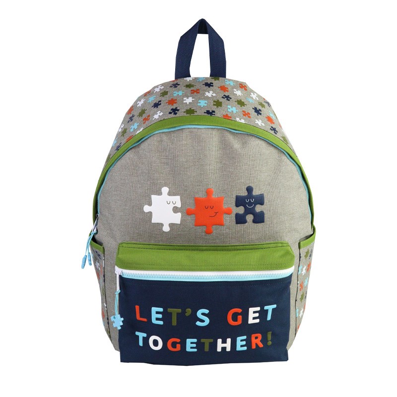 Ruksak za školu s motivima puzzla. Prednji i bočni džepovi, pojačano dno i leđa. Gumeni detalji.