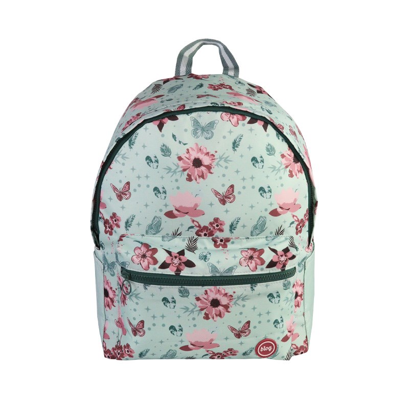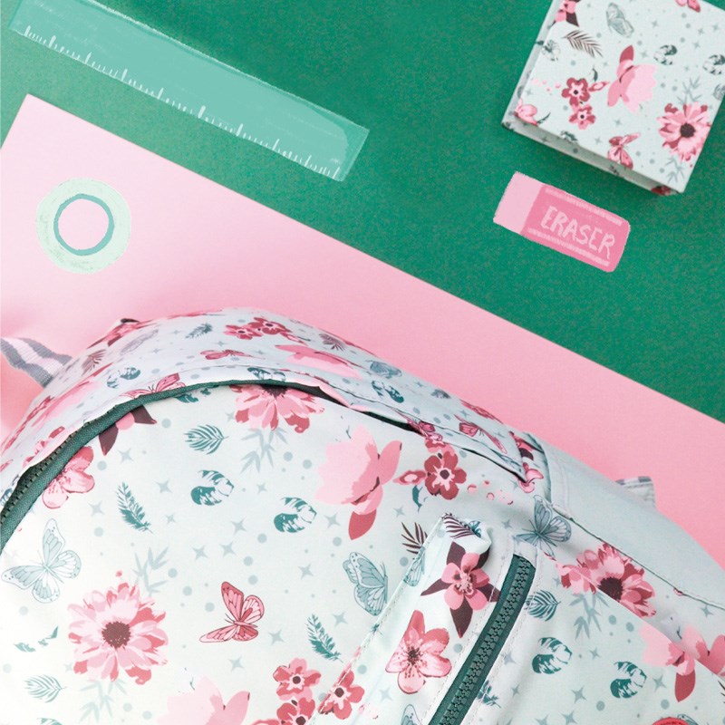 Ruksak za školu cvjetnog uzorka s prednjim i boćnim džepovima, pojačanim leđima i naramenicama te unutarnjim džepom za laptop. Vodootporni materijal.
