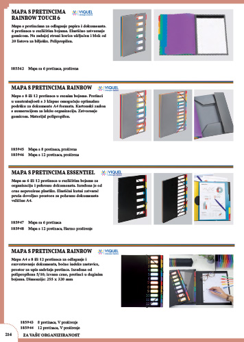 Organizacijska mapa od kvalitetnog prešpan kartona i kutnim gumicama za zatvaranje, 12 pretinaca s indeksom u boji i numeracijom 1-12, mogućnost upisa sadržaja na naslovnici. Za pohranu dokumenata do formata A4. Dimenzije: 240x320x5 mm