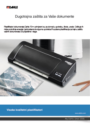 Plastifikator s dva grijana silikonska valjka za debljina folije od 80 do 125 mic, brzina do 250 mm/min. Oslobađanje folije u slučaju zaglavljenja. Zagrijavanje 4--6 min, Topla i hladna plastifikacija. Dim. 360 x 80 x 150mm, 1,4kg