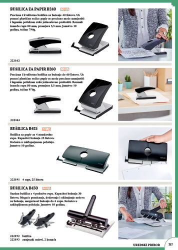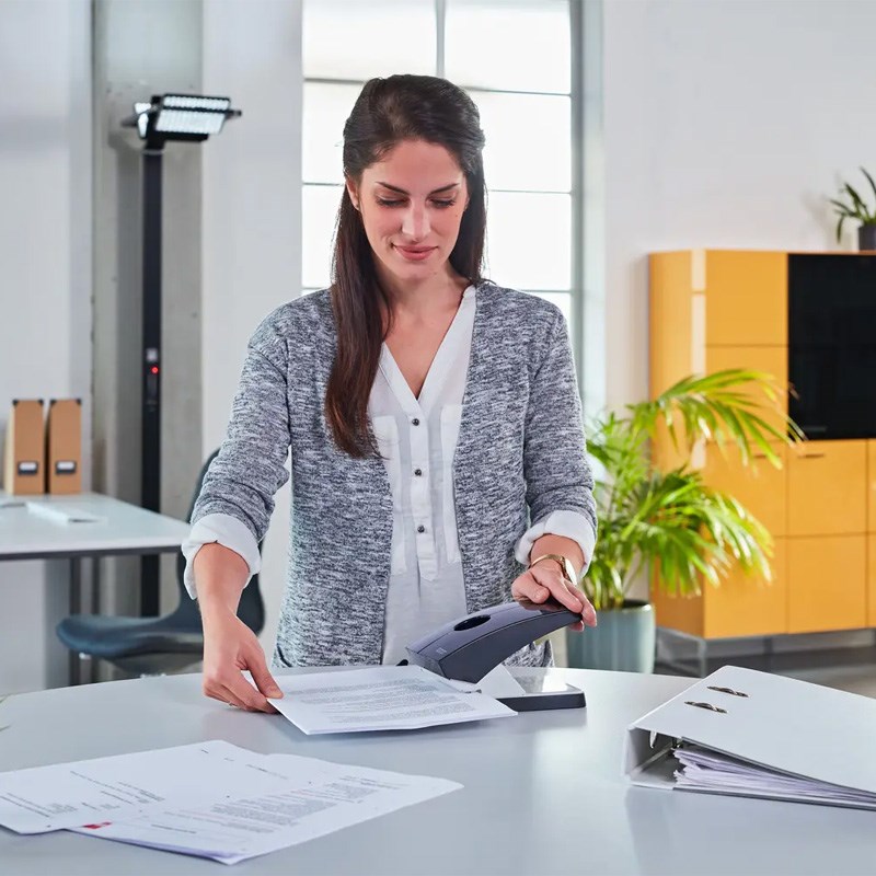 Precizna i kvalitetna bušilica za bušenje 40 listova. Uz pomoć plastične ručice papir se precizno može namjestiti i laganim potiskom ruke jednostavno probušiti.