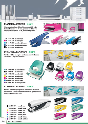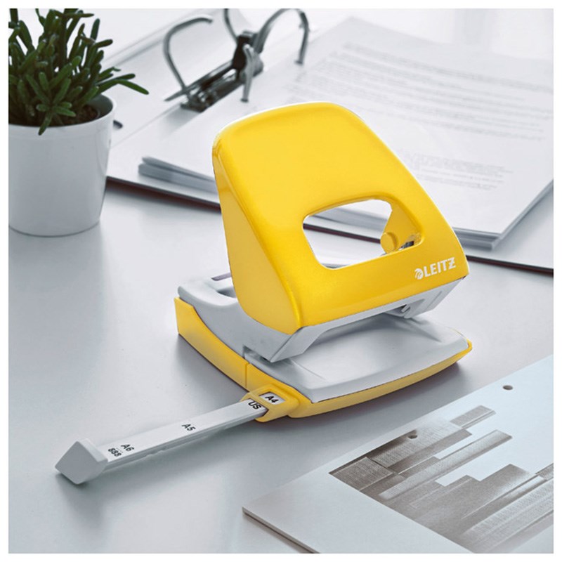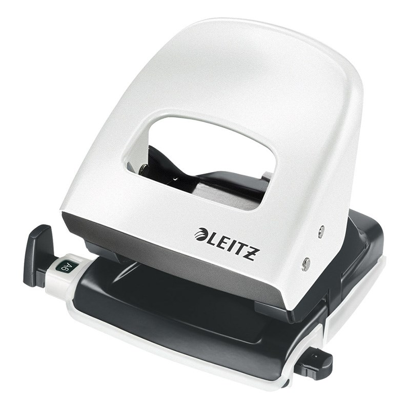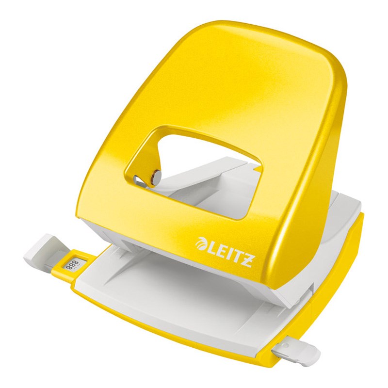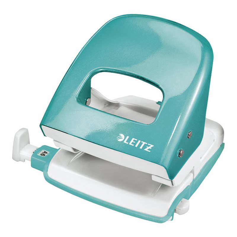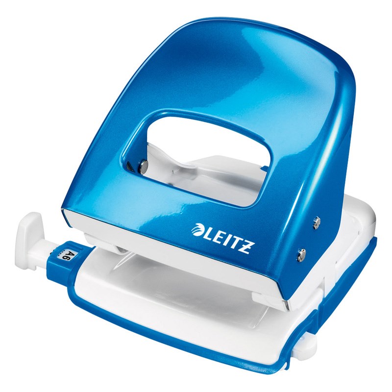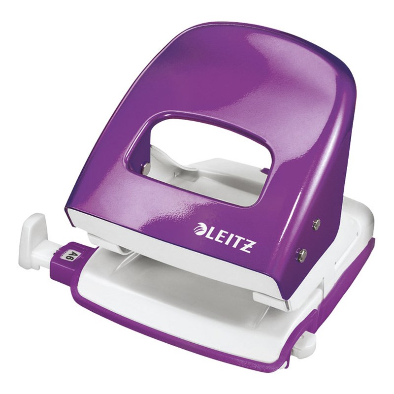 Metalna bušilica za papir u modernim metalik bojama.Jednostavno pražnjenje. Na dnu su gumice protiv sklizanja. Graničnik, 2 rupe, do 30 listova.