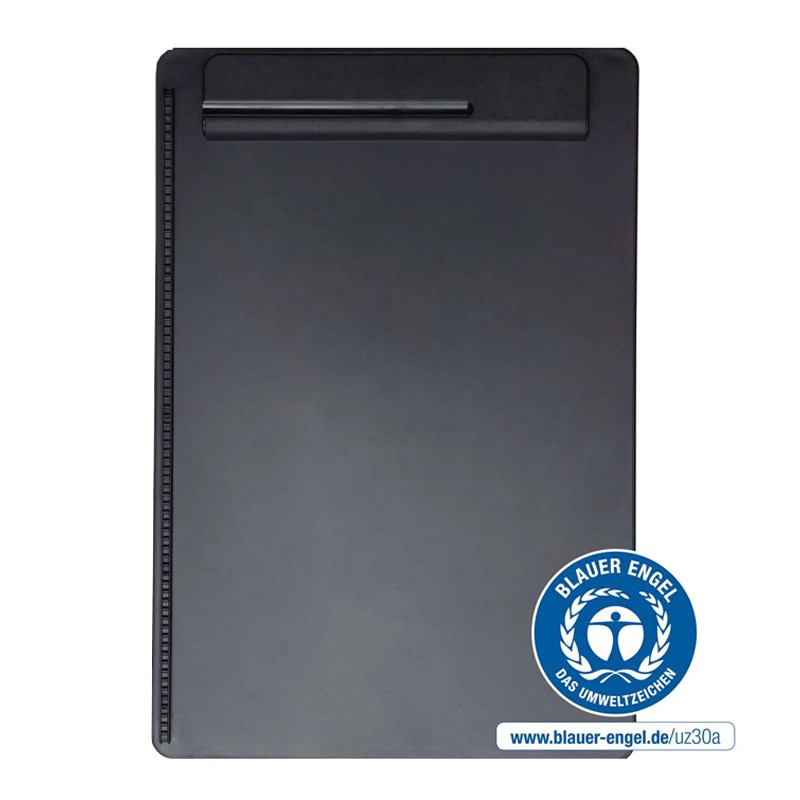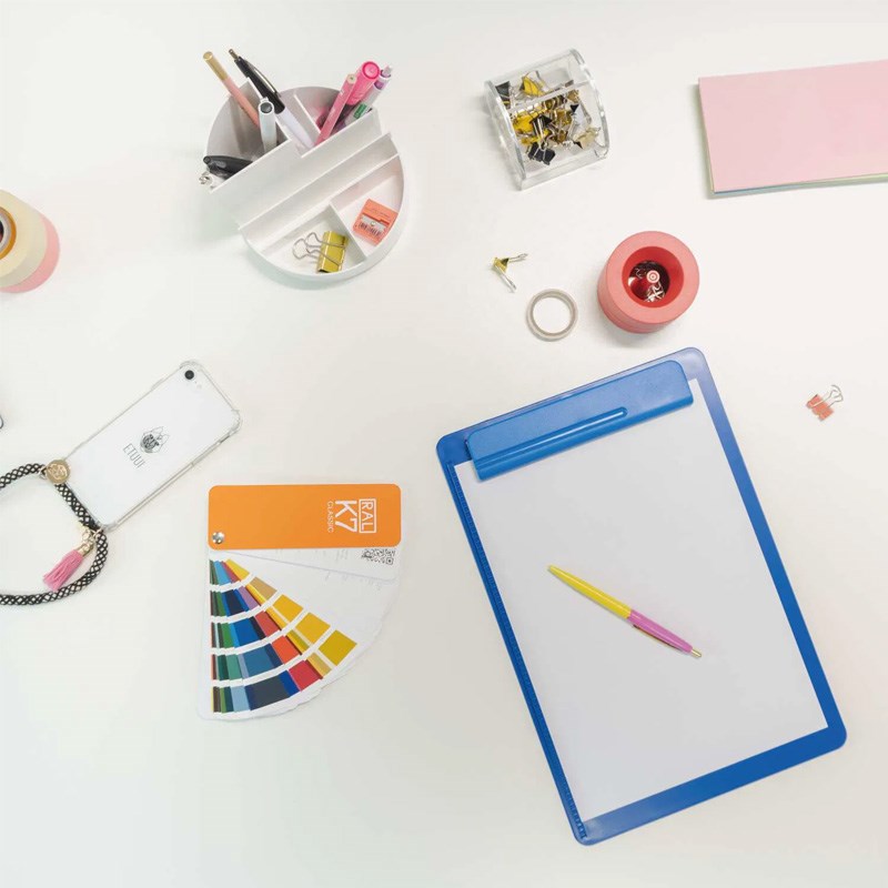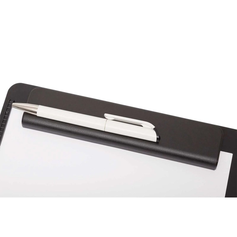 Čvrsta plastična podloga s velikom plastičnom kopčom za držanje papira, držač za olovku kao dio kopče. Ploča i kopča u istoj boji.