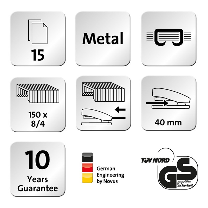 Metalni stroj za klamanje u obliku kliješta za profesionalnu upotrebu. Kvalitetno spajanje do 15 listova. Dubina klamanja do 40 mm.