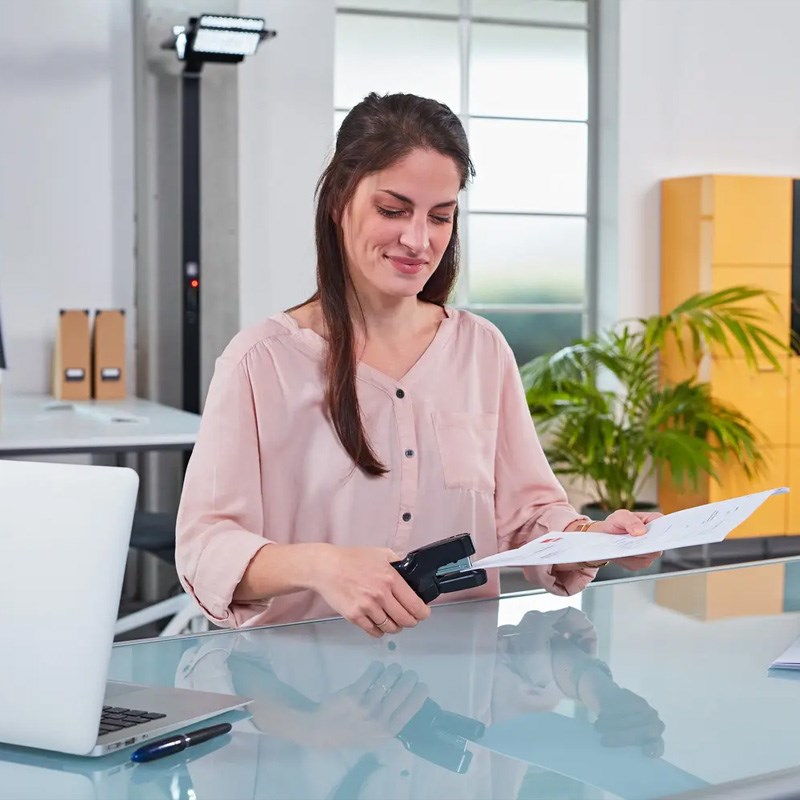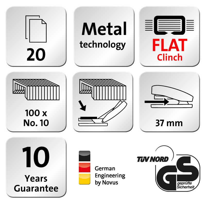 Ručna praktična klamerica sa Flat-Clinch tehnologijom (plošno spajanje štedi 30% prostora kod odlaganja). Kapacitet 20 listova. Dubina 37 mm.
