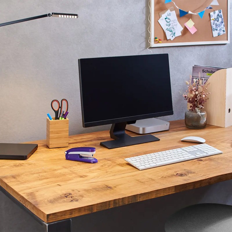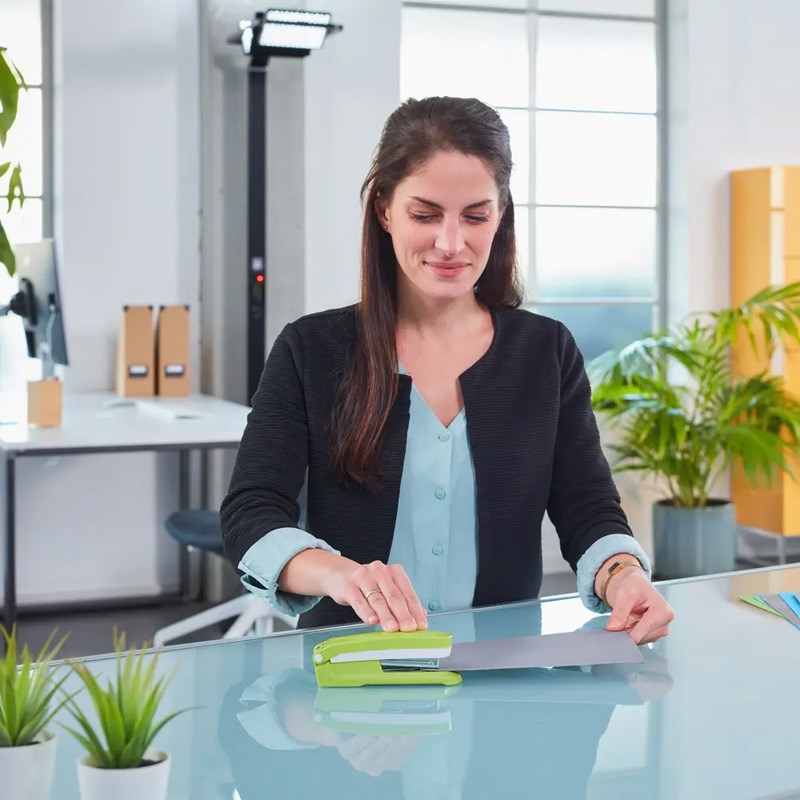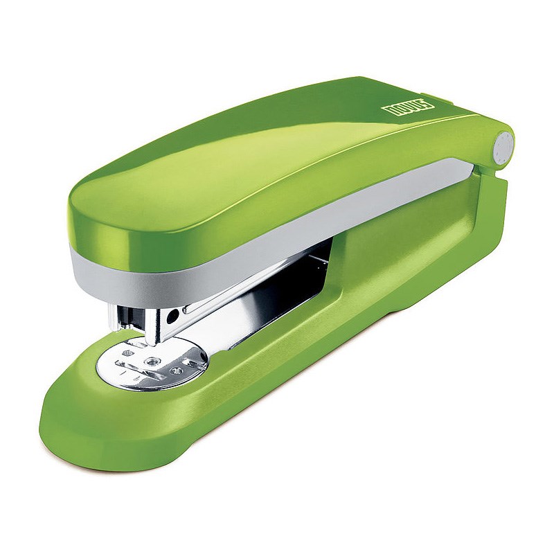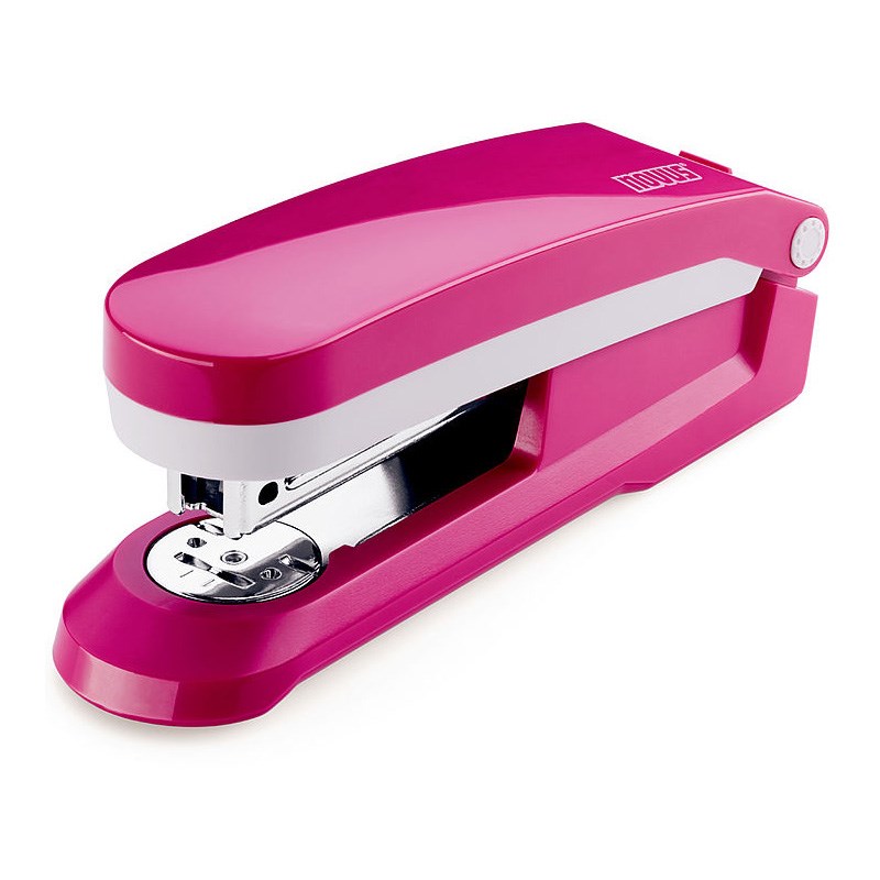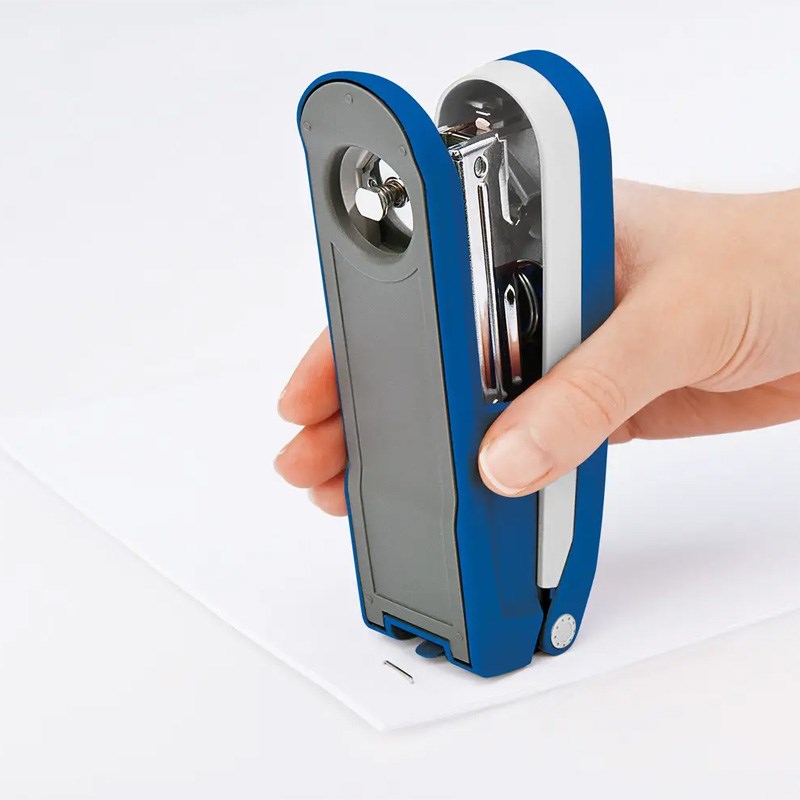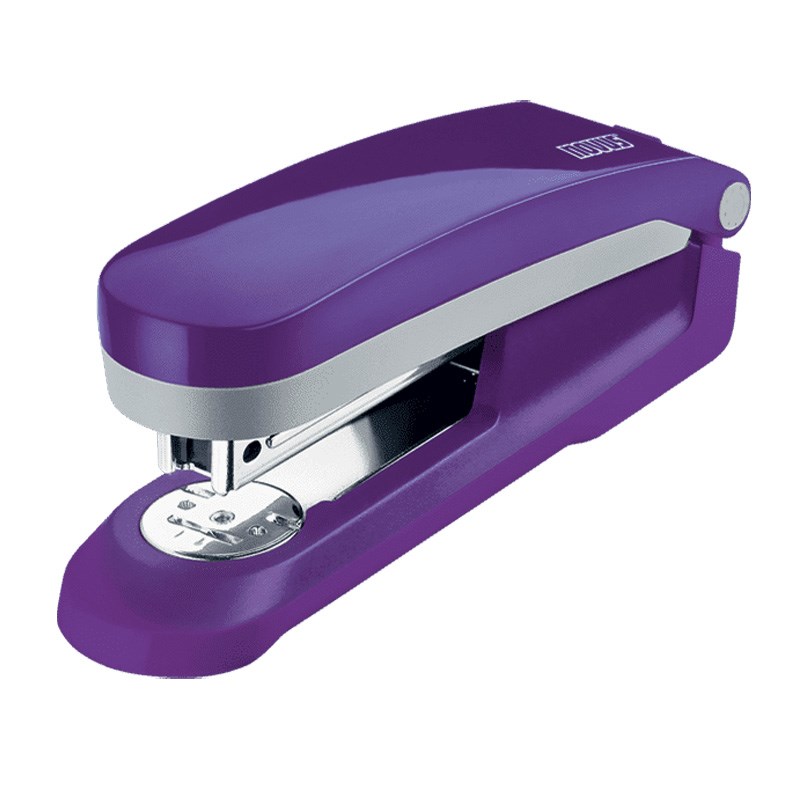 Moderna uredska klamerica za spajanje papira. Metalno kučište s plastičnim ovitkom u atraktivnim bojama. Ugrađena deklamerica. Čvrsto stojeća baza koja ne klizi.