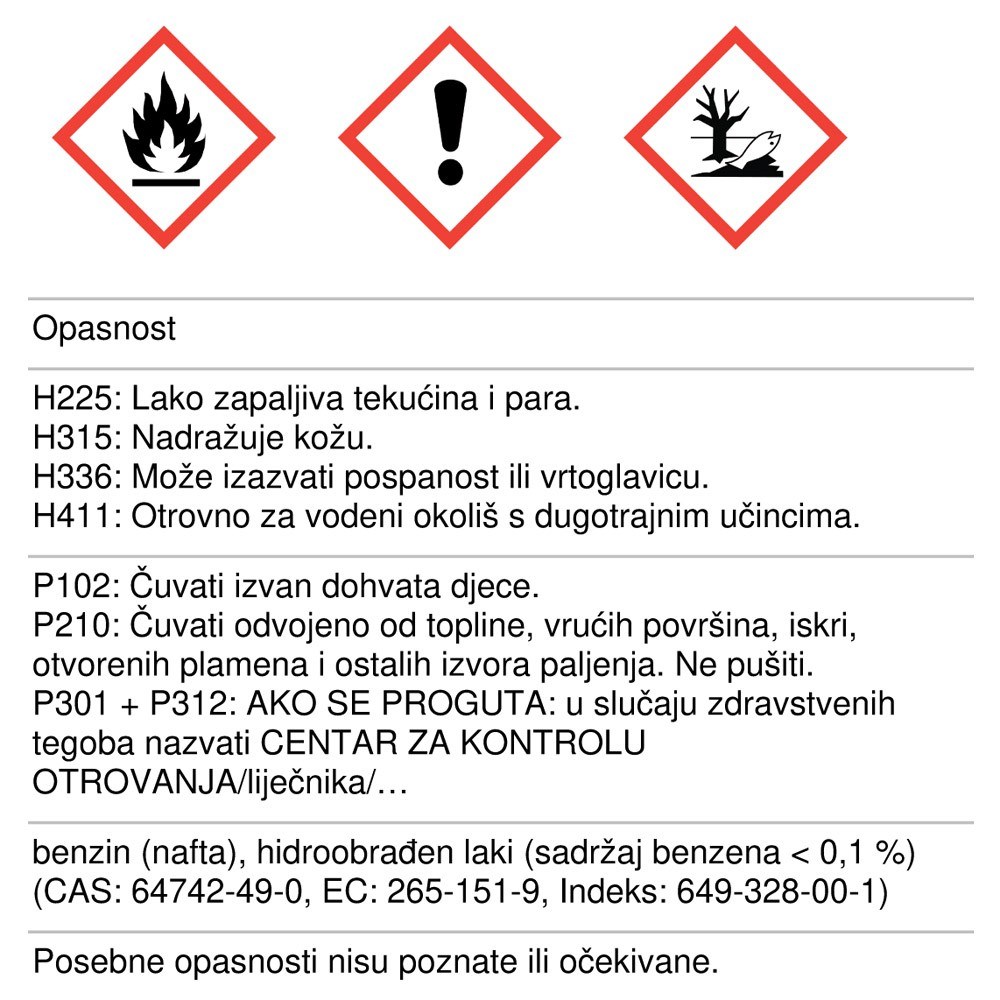 Sadrži: benzin (nafta), hidroobrađen laki (sadržaj benzena < 0,1 %) (CAS: 64742-49-0, EC: 265-151-9, Indeks: 649-328-00-1); opasno