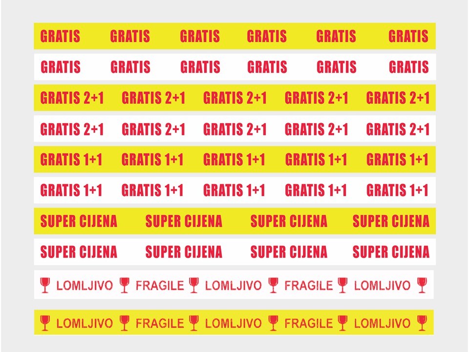 PP samoljepljiva traka 25mm x 66m s otisnutim tekstom "LOMLJIVO" ili "SUPER CIJENA" u nekoliko kombinacija.