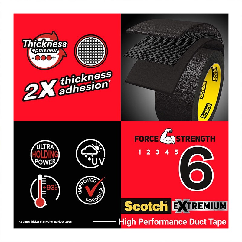 Kada vam je potrebna maksimalna čvrstoća držanja za najteže popravke, nabavite Scotch® Extremium™ ULTRA visokoučinkovitu ljepljivu traku. Njezino ljepilo od prirodnog kaučuka trenutno se i agresivno lijepi na razne površine, uključujući metal, plastiku i zatvoreni beton, što je čini pogodnom za širok raspon primjena. Ima snažnu, usku tkaninu i vrhunsku podlogu koja je dva puta deblja od ostalih Scotch® ljepljivih traka. Ova traka otporna je na vodu i UV zračenje, za dodatnu čvrstoću u vlažnim i sunčanim okruženjima.