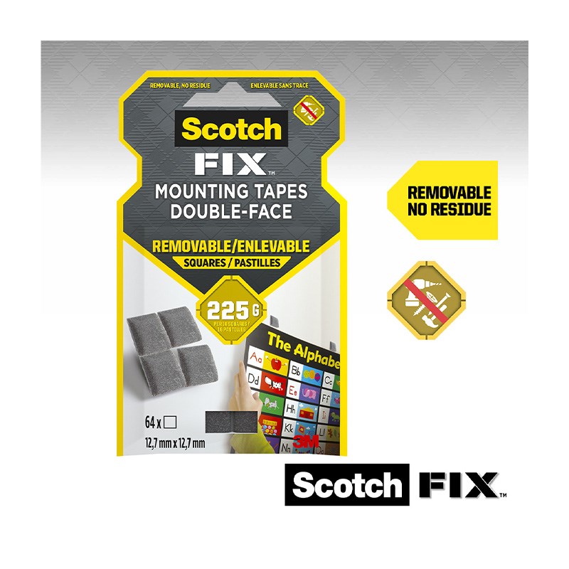 Scotch-Fix™ uklonjivi obostrano ljepljivi jastučići, koji ne ostavljaju tragove, idealni su za laganu montažu i privremeno pričvršćivanje. Mogu se koristiti na metalu, staklu, ogledalima, glatkom drvu, akrilu, plastici i drugim glatkim površinama.