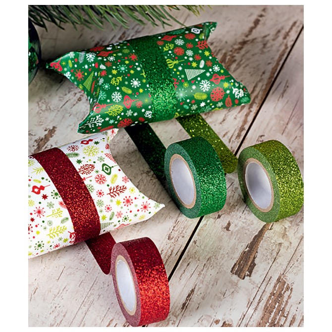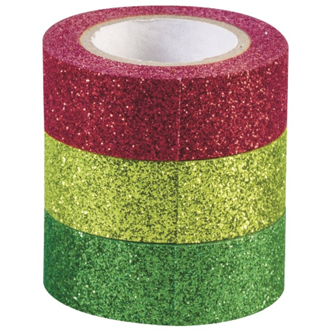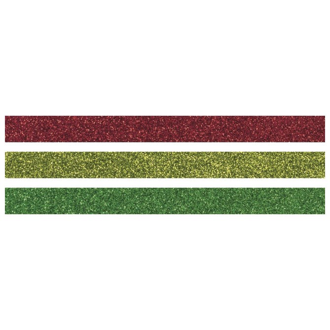 Ukrasna ljepiva traka za zamatanje poklona, ukrašavanje, izradu čestitki. Set od 3 boje sa šljokicama. Dimenzija 15mm x 3m