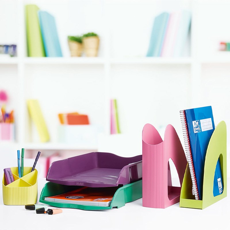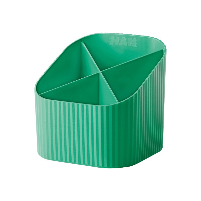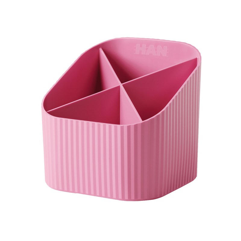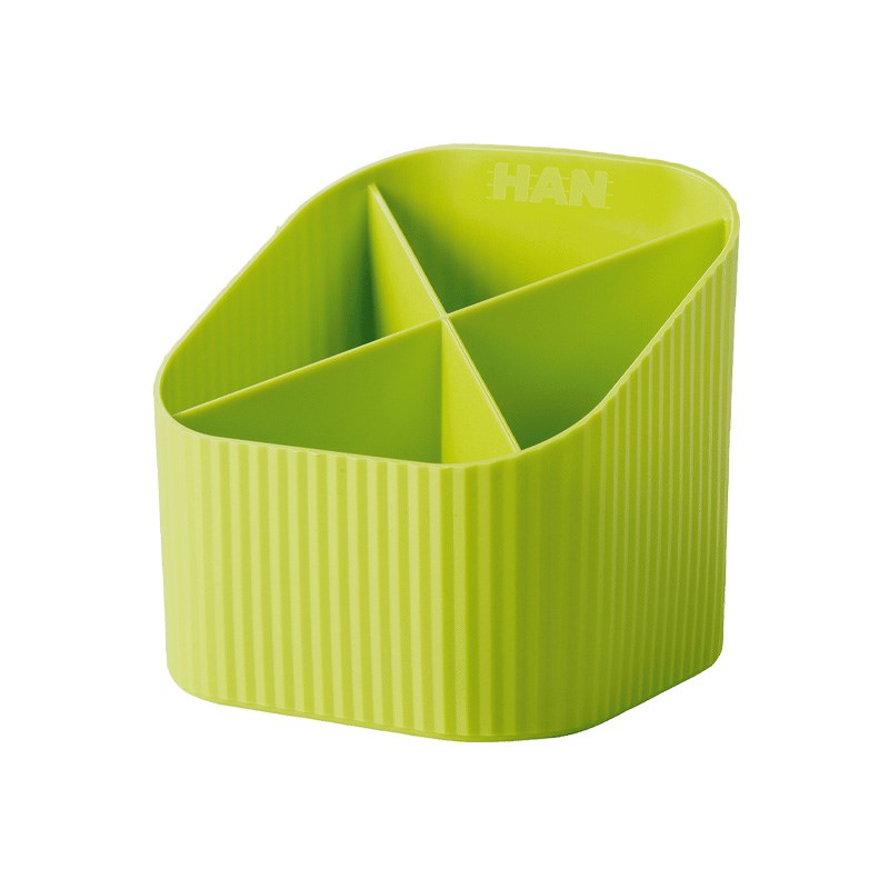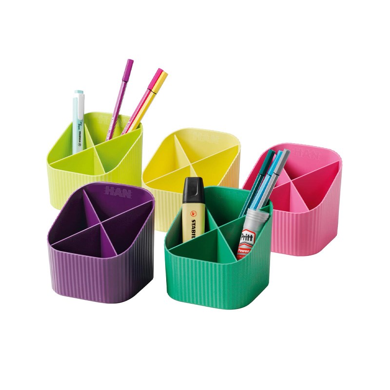 Stalak za olovke s četiri pretinca od reciklirane plastike. Atraktivne moderne boje.