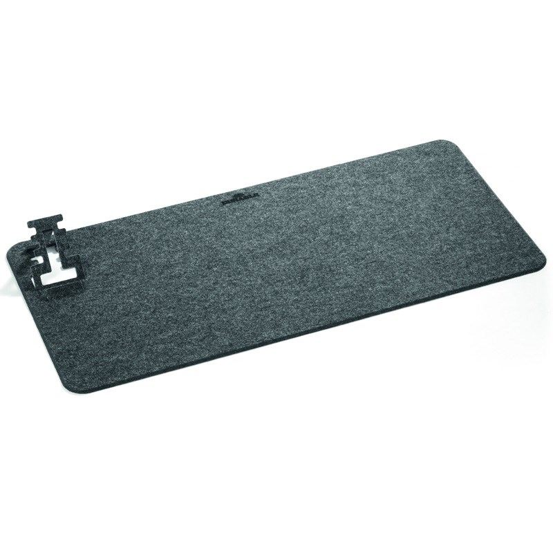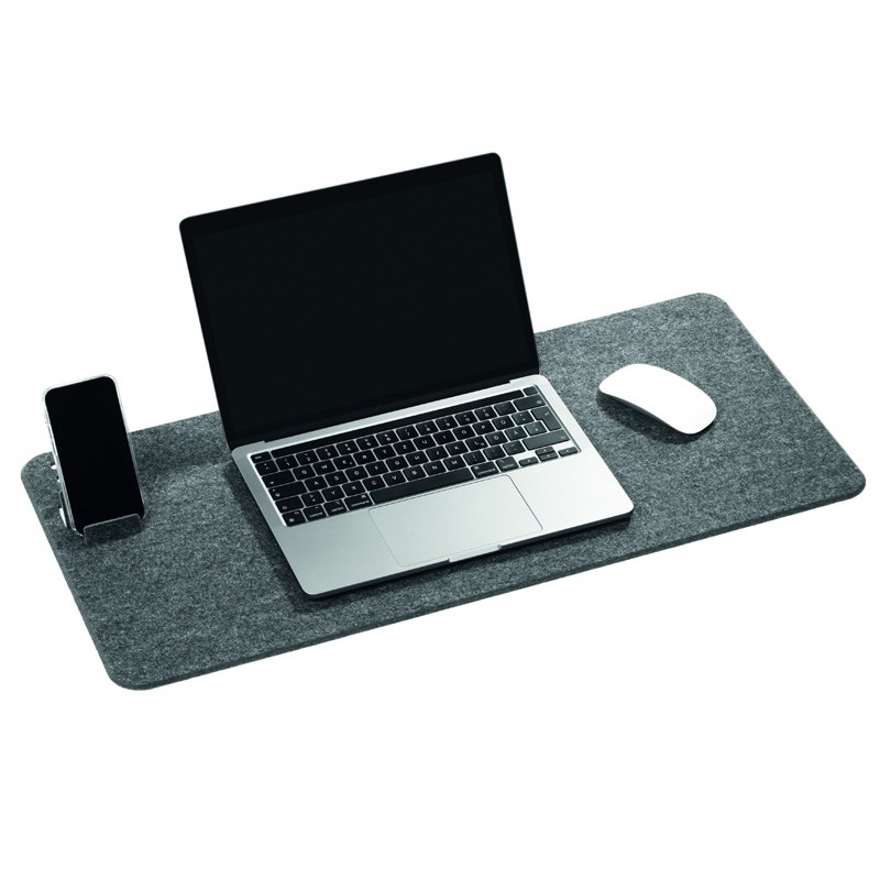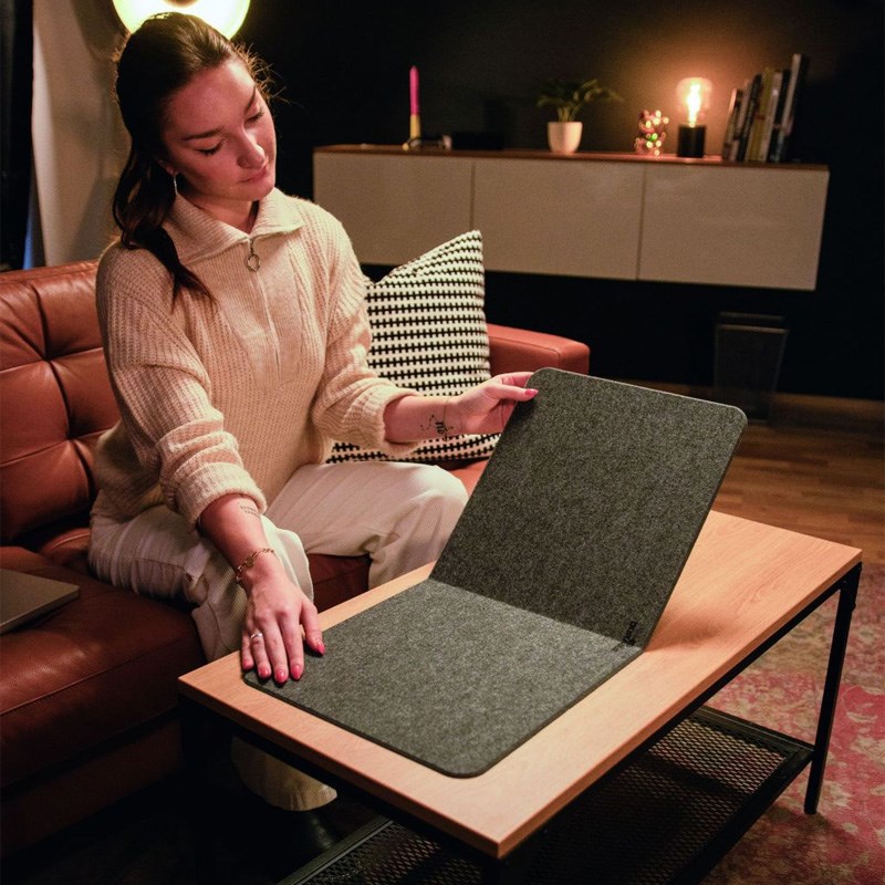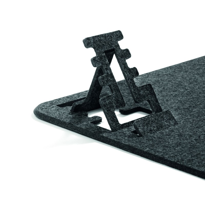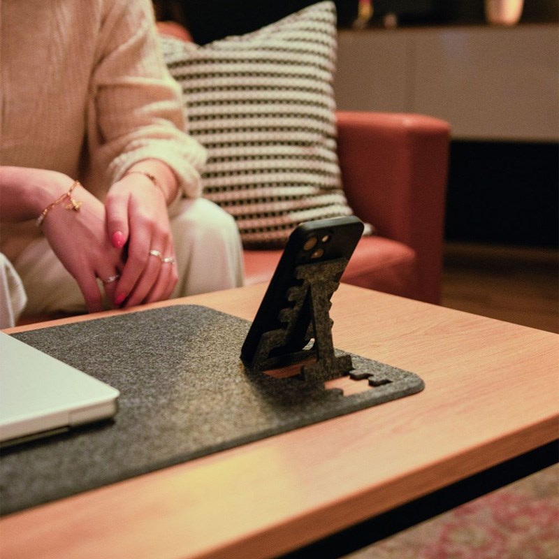 Sklopiva stolna podloga EFFECT s integriranim držačem za mobilni telefon savršeno je rješenje za moderne nomade. Zahvaljujući materijalu, podloga za radni stol uklapa se u svako okruženje i stvara ugodan osjećaj i atmosferu. Materijal od filca pozitivno utječe na akustiku učinkovito apsorbirajući ometajuće zvukove, a ugodna površina stolne podloge nudi prvoklasno iskustvo pisanja dok štiti stolove od ogrebotina i mrlja. Kada je rasklopljena, to je podloga za stol; kada je presavijena, može biti ukrasna podloga za vašu dekoraciju nakon posla. Zahvaljujući novom formatu, stolna podloga pristaje i na uske stolove. S zatvorenom veličinom od 350x330 mm, podloga za stol se može spremiti i ponijeti sa sobom. Izrađena od 60% recikliranog PET-a i s ambalažom koja je potpuno bez plastike.