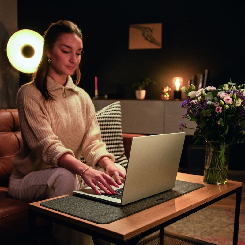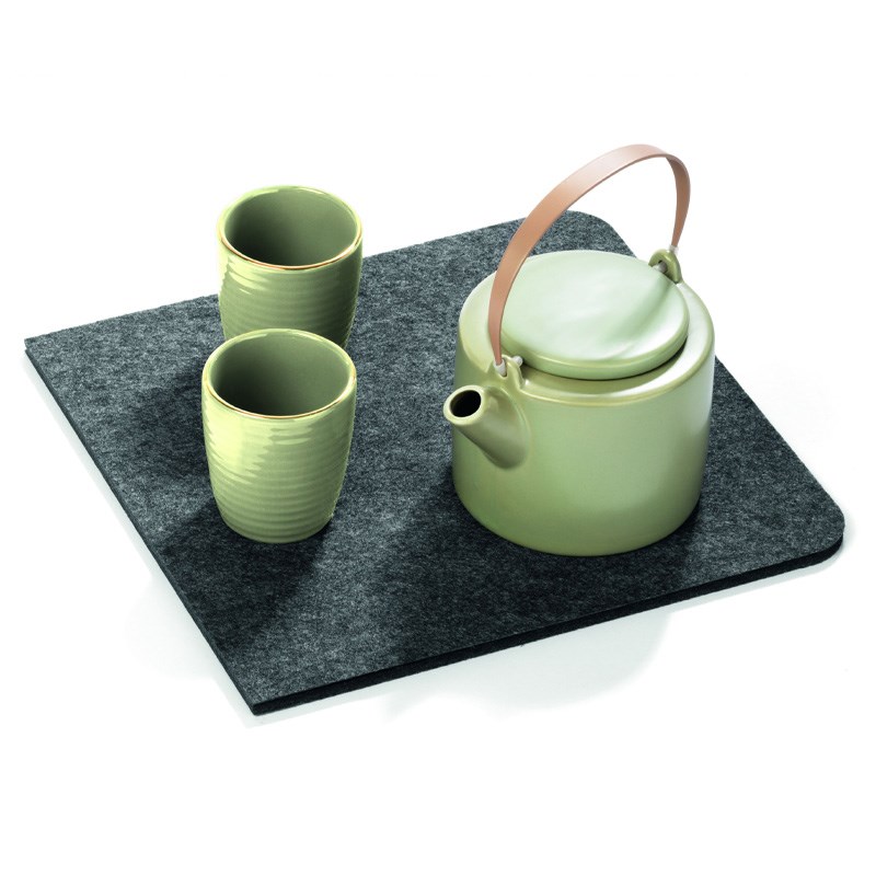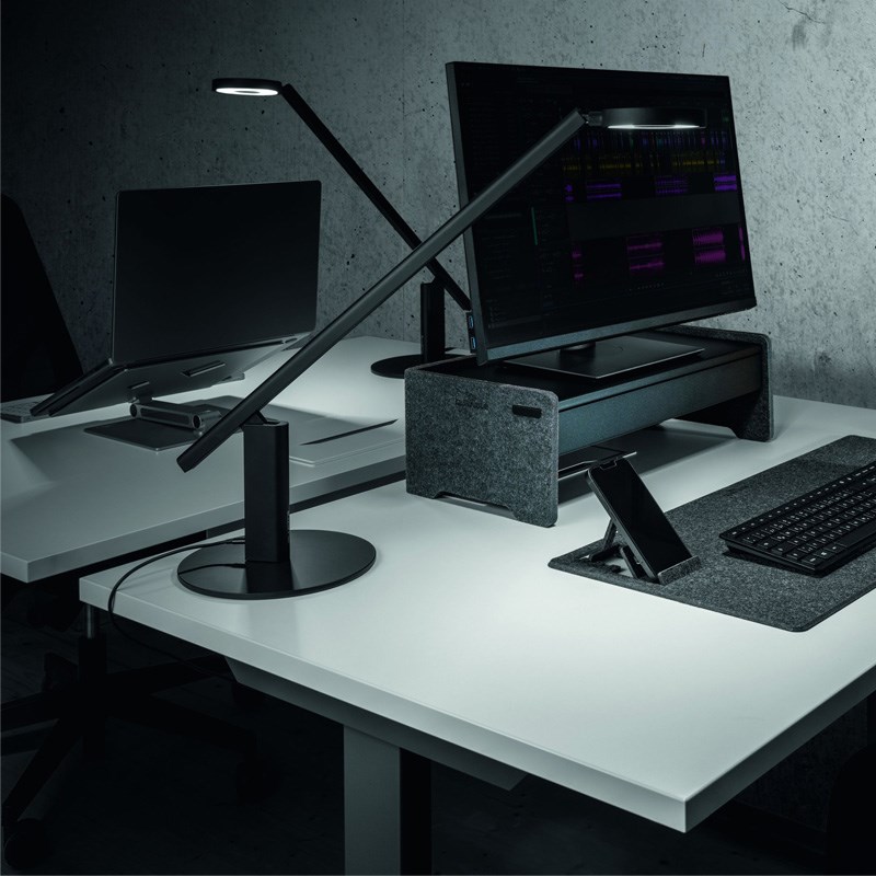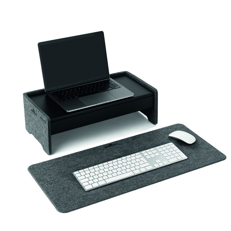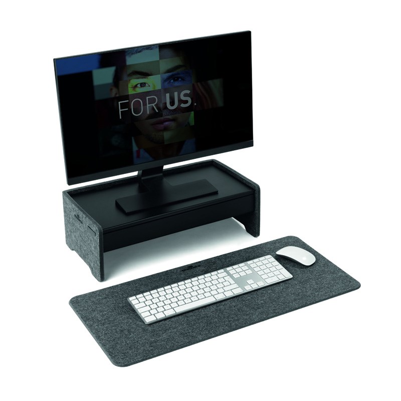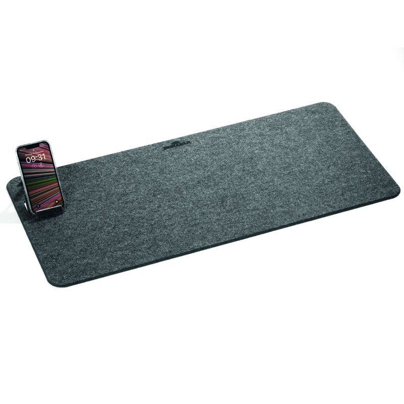 Sklopiva stolna podloga EFFECT s integriranim držačem za mobilni telefon savršeno je rješenje za moderne nomade. Zahvaljujući materijalu, podloga za radni stol uklapa se u svako okruženje i stvara ugodan osjećaj i atmosferu. Materijal od filca pozitivno utječe na akustiku učinkovito apsorbirajući ometajuće zvukove, a ugodna površina stolne podloge nudi prvoklasno iskustvo pisanja dok štiti stolove od ogrebotina i mrlja. Kada je rasklopljena, to je podloga za stol; kada je presavijena, može biti ukrasna podloga za vašu dekoraciju nakon posla. Zahvaljujući novom formatu, stolna podloga pristaje i na uske stolove. S zatvorenom veličinom od 350x330 mm, podloga za stol se može spremiti i ponijeti sa sobom. Izrađena od 60% recikliranog PET-a i s ambalažom koja je potpuno bez plastike.