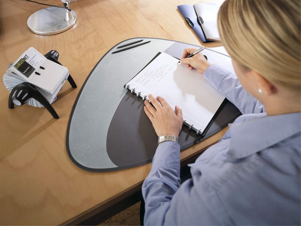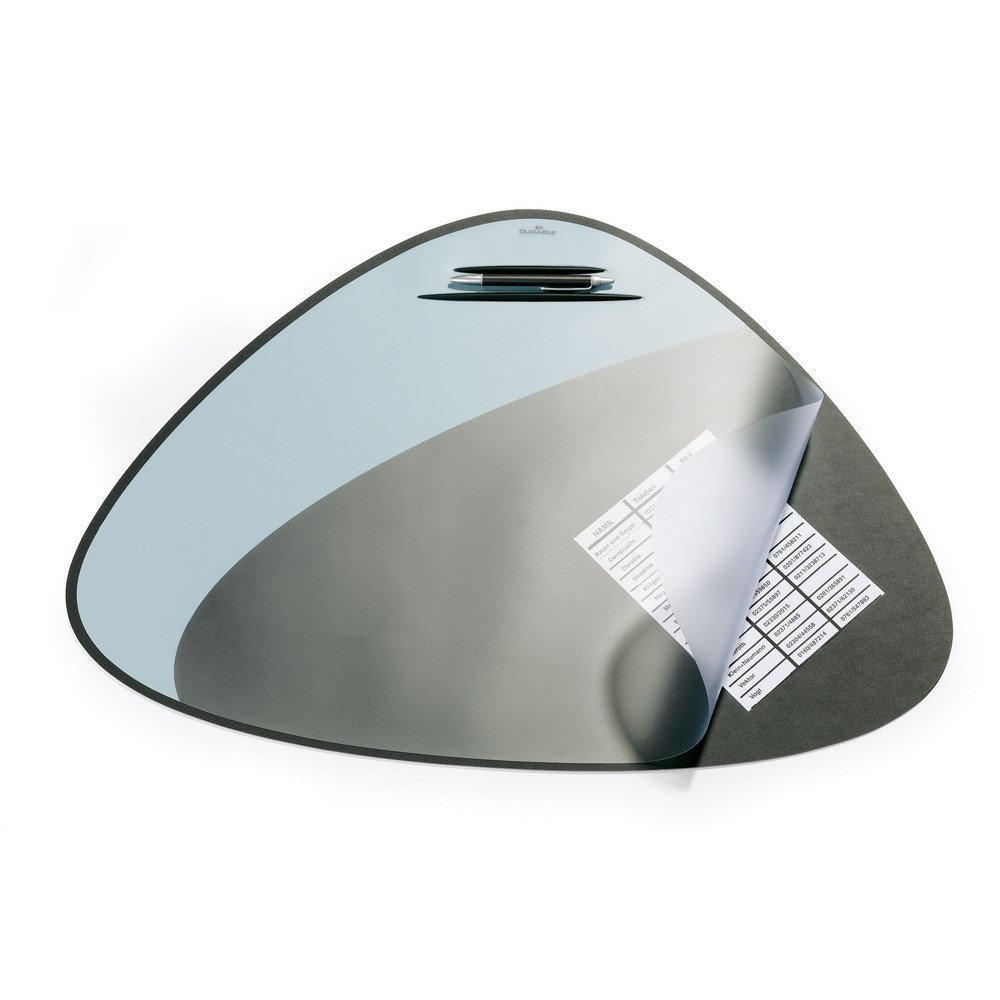 Stolna podloga ovalno trokutastog oblika veličine 69x51 cm s mat folijom za odlaganje poruka i rebrastim stalkom za par olovaka.