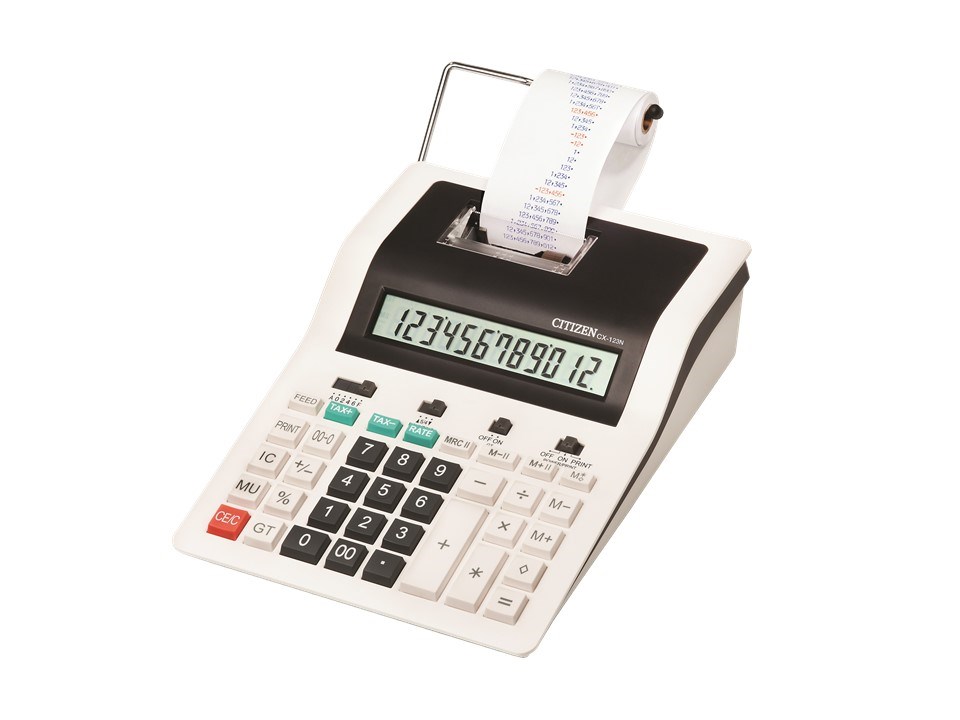Električni kalkulator s pisačem i 12 znamenaka. Metalni držač trake i LCD ekran. Dupla memorija. Rola 57 mm. Brzina ispisa: 2,7 reda/sekundi. Valjak tintni dvobojni (crna/crvena) IR40T