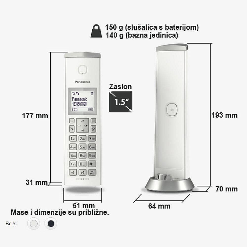 Dimenzije: Baza 64 x 70 x 193mm, 140g / Slušalica 51 x 31 x 177 mm, 150g