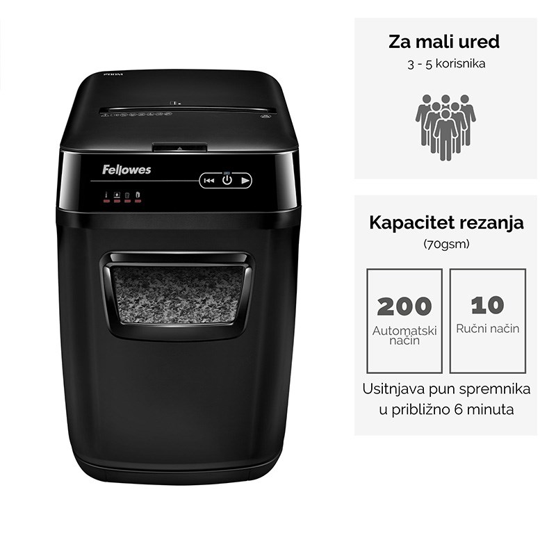 Uredski uništavač AutoMax 200M za 1 korisnika uništava do 200 listova papira u komadiće veličine 2 x 14mm (DIN-P5). Do 200 listova papira jednostavno stavite u uređaj, zatvorite i odete svojim poslom. Patentirani AccuFeed sustav omogućuje brzo uništavanje dokumenata bez uporabe ruku, dok značajka Auto Reverse zaustavlja i vraća papir ako dođe do zastoja, čime se smanjuju zaglavljivanja i frustracije. Sleep mode gasi uređaj nakon 2 minute neaktivnosti. Ne smetaju mu spajalice i klamarice, kartice.