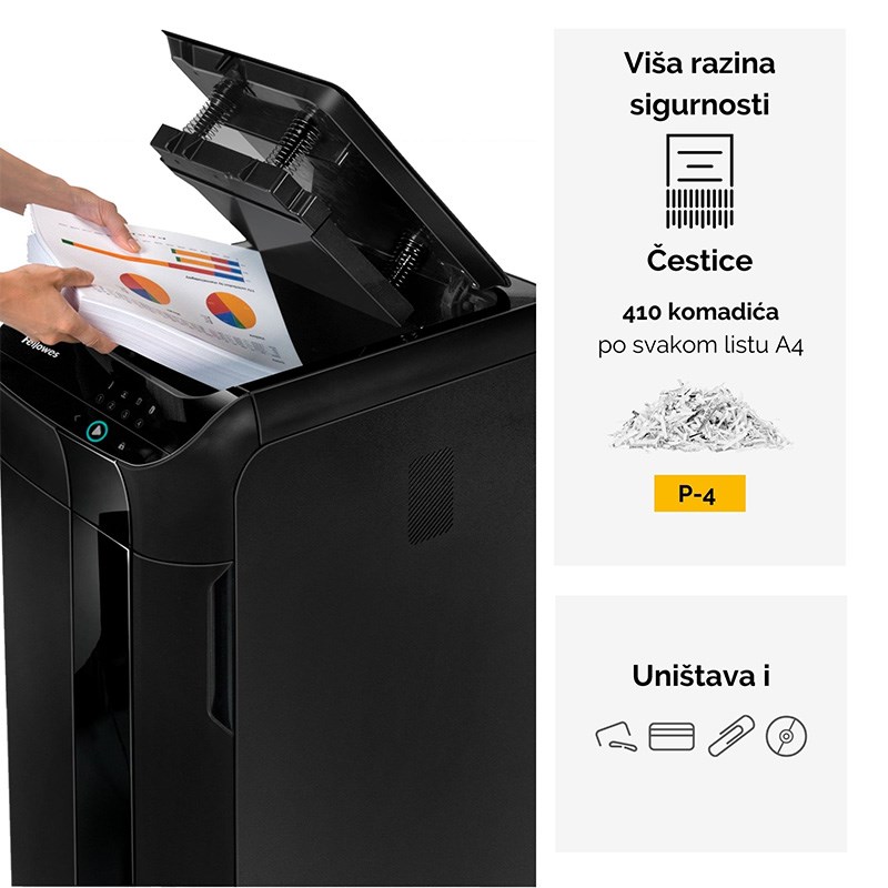 Odjelni uništavač AutoMax 550C za više od 5 korisnika uništava do 550 listova papira u komadiće veličine 4 x 38mm (DIN-P4). Prevladava ograničenja tradicionalnih AF uređaja, jer se može nositi s različitim vrstama papira. To uključuje i zgužvane papire, sjajni i zaklamani papir (do 20 listova). Do 550 listova papira jednostavno stavite u uređaj, zatvorite i odete svojim poslom